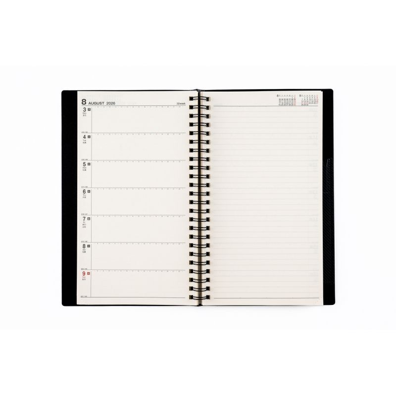 【週間予定表】左ページは1週間分のスケジュール欄、右ページはフリーの横ケイメモ。スケジュール欄にはタイム目盛りも付いています。忙しいあなたの予定をしっかり管理します。