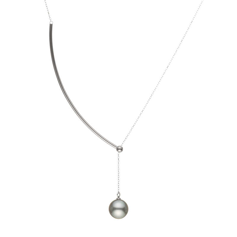 Pt850のチェーンに黒蝶パールをあしらった、洗練された印象のペンダントネックレス。