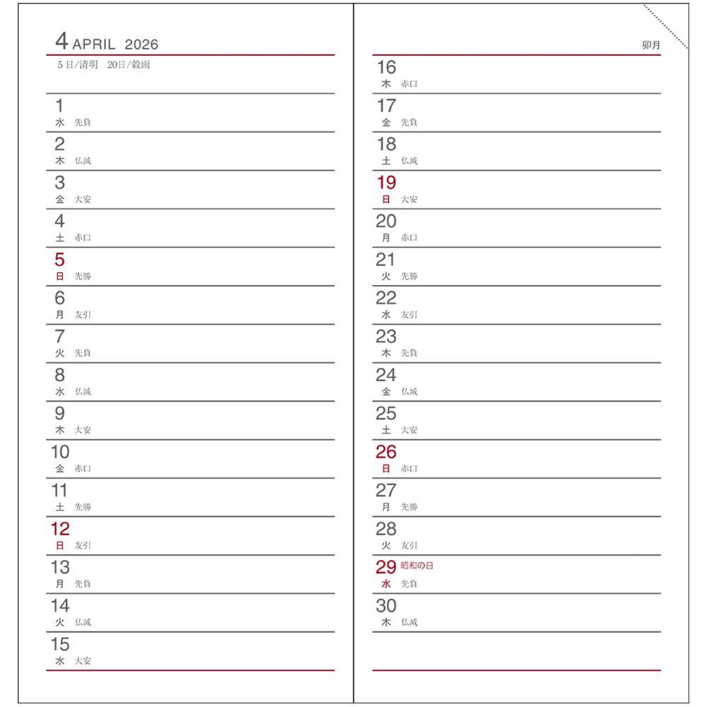 内容:カレンダー・年間スケジュール・月間予定表・横罫・パーソナルノート・住所録、緊急連絡先メモ・年齢早見表
