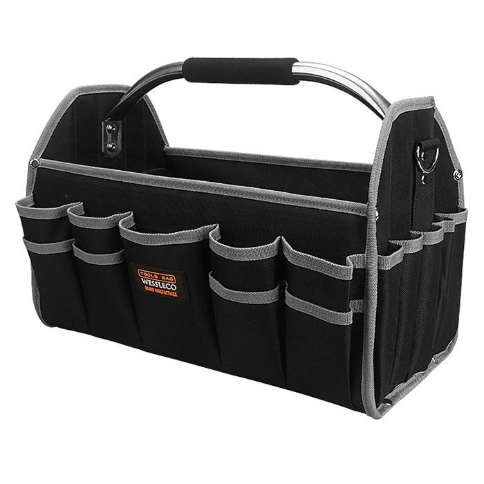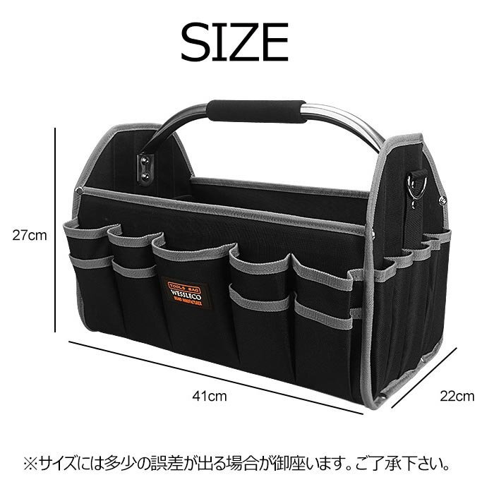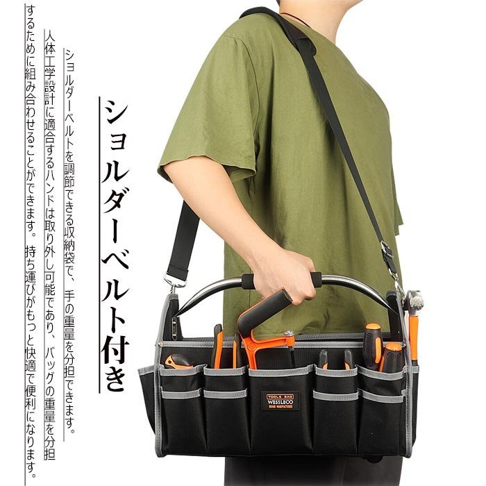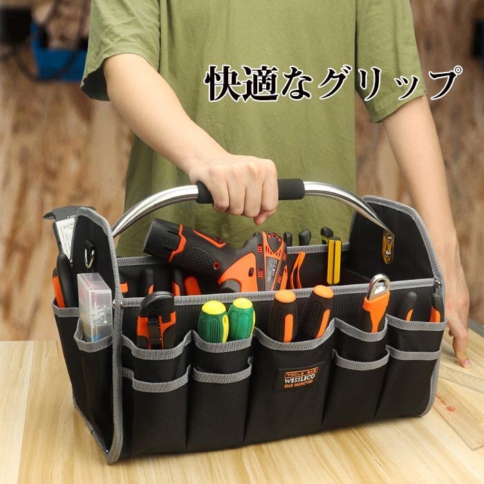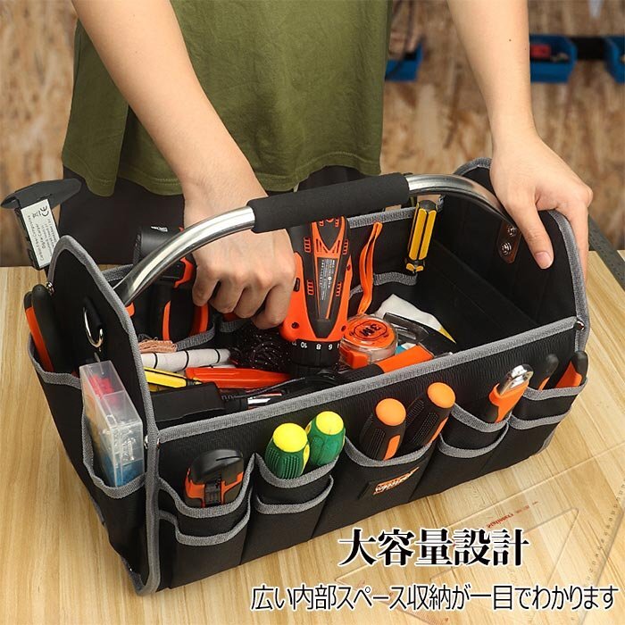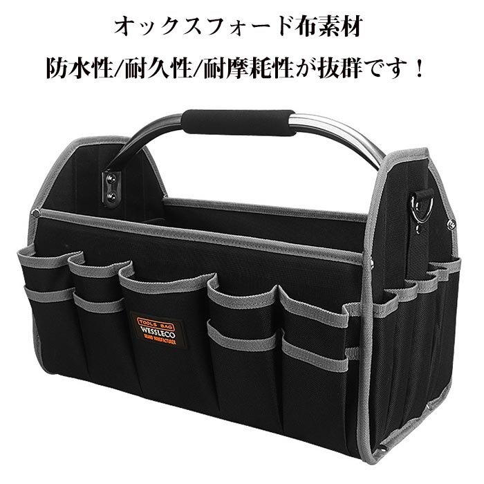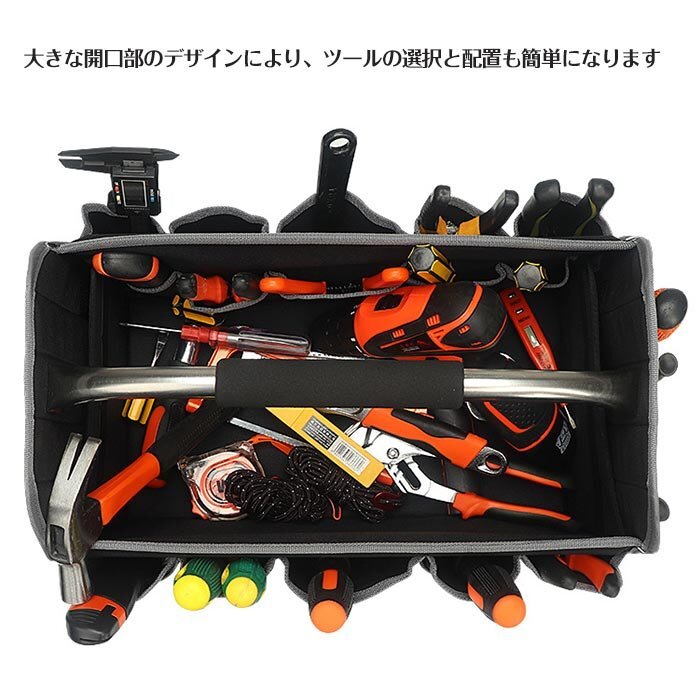 【オックスフォード素材,防水素材】 高密度オックスフォード布素材を採用し、防水性&耐久性&耐摩耗性が抜群です, 大きな開口部のデザインにより、ツールの選択と配置も簡単になります。