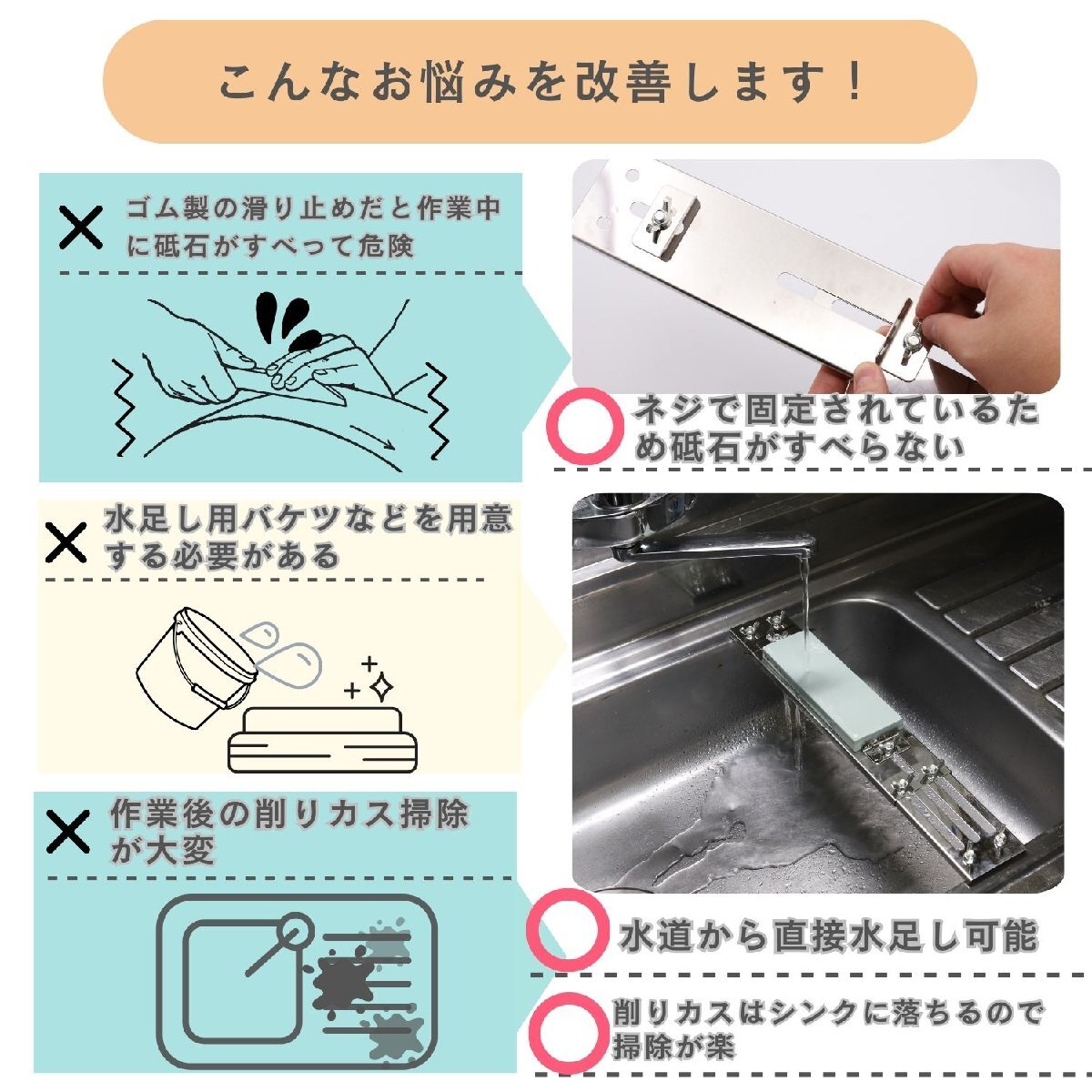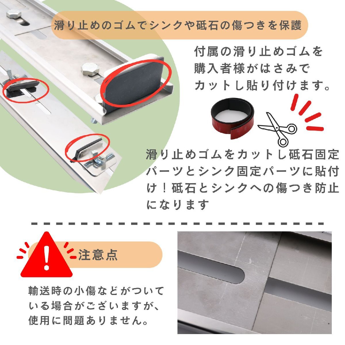• 【付属のゴムテープで保護】付属のゴムテープを貼り付けることで砥石とシンクへキズが付くのを防止!従来より快適に作業ができるように!
