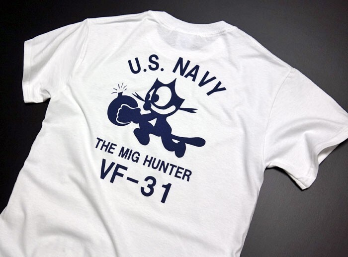 前面左胸にはステンシルデザインで「USN」マーク、背面には爆弾キャット&航空隊VF-31・MIG.HUNTERのロゴプリントが入ったモデル。
