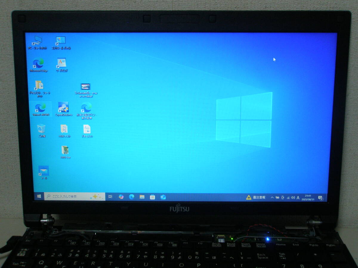 | 商品説明 | 富士通ノートパソコン A553/GX から外した液晶パネルです。 15.6型ワイド 1366*768 無線LANカード付です。 無線LANカード付を止めるネジ1本も付属します。 同機種の LIFEBOOK A573/GW に付け替えて動作確認しました(写真3-4)。 天板は数ヶ所に擦り跡がありますが、全体的にはきれいです。 液晶面は傷、汚れ少なく、きれいです。 液晶表示は良好です。 起動時の赤みはありません。 常時点灯や色むらなどは無く、明るさも充分あり、まず問題なく発色しています。 写真3は Windows10 の背景画面ですが、単色の背景画面でも表示チェックしています(写真4)。 液晶ケーブルコネクタサイズ:長さ約 24mm (写真10) 無線LANカードの動作もOKです。 無線LAN(Wi-Fi)に接続し、ヤフージャパンの画面を表示できました(写真5)。 以下の LIFEBOOK シリーズで共用できます。 A553/G A553/GW A553/GX A553/H A553/HW A553/HX A573/G A573/GW A573/GX |