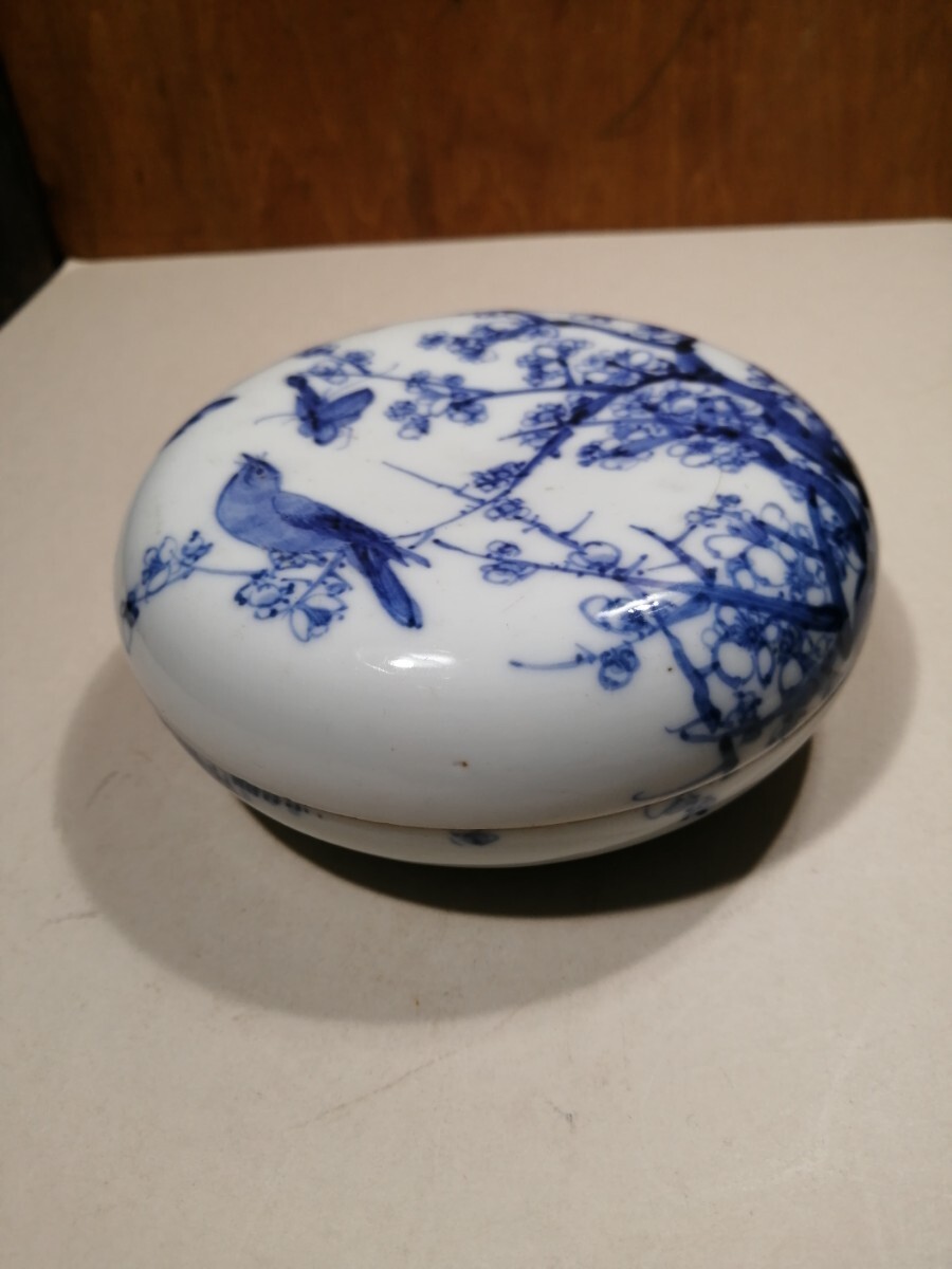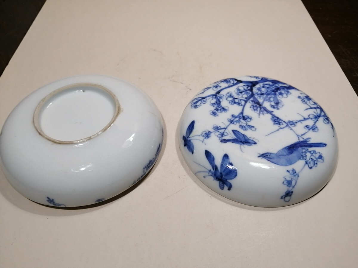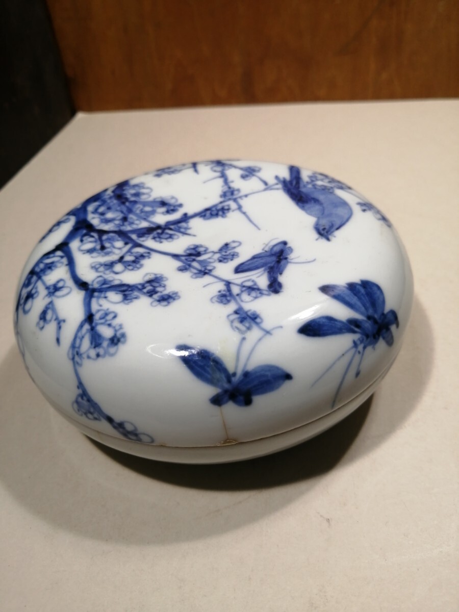 清朝道光の染付の盒子です。蓋には梅に鶯が、見込みには菊の染付があります。上がりの良い清楚な器です。蓋と中子にニューがあります。箱付きです。
