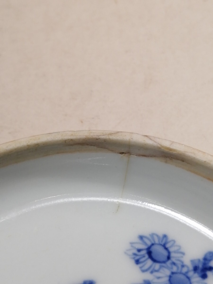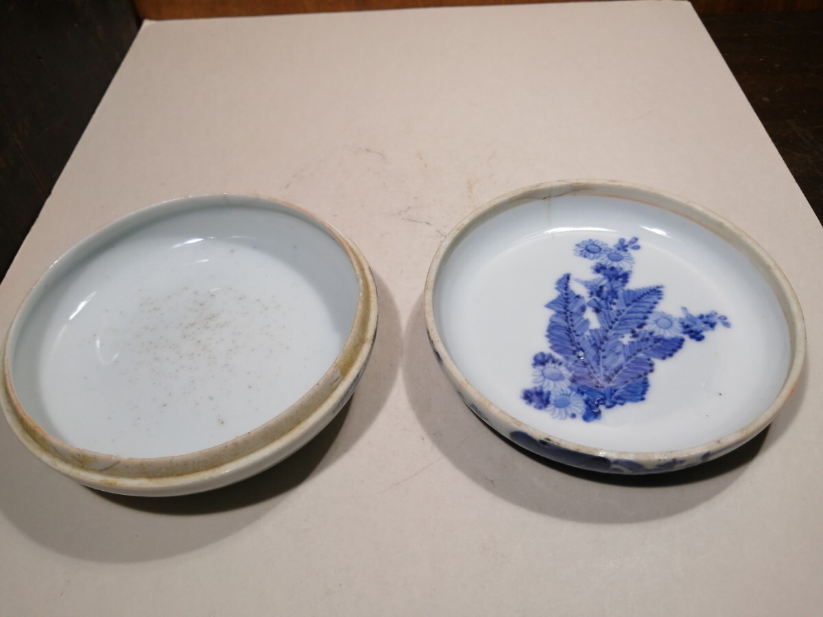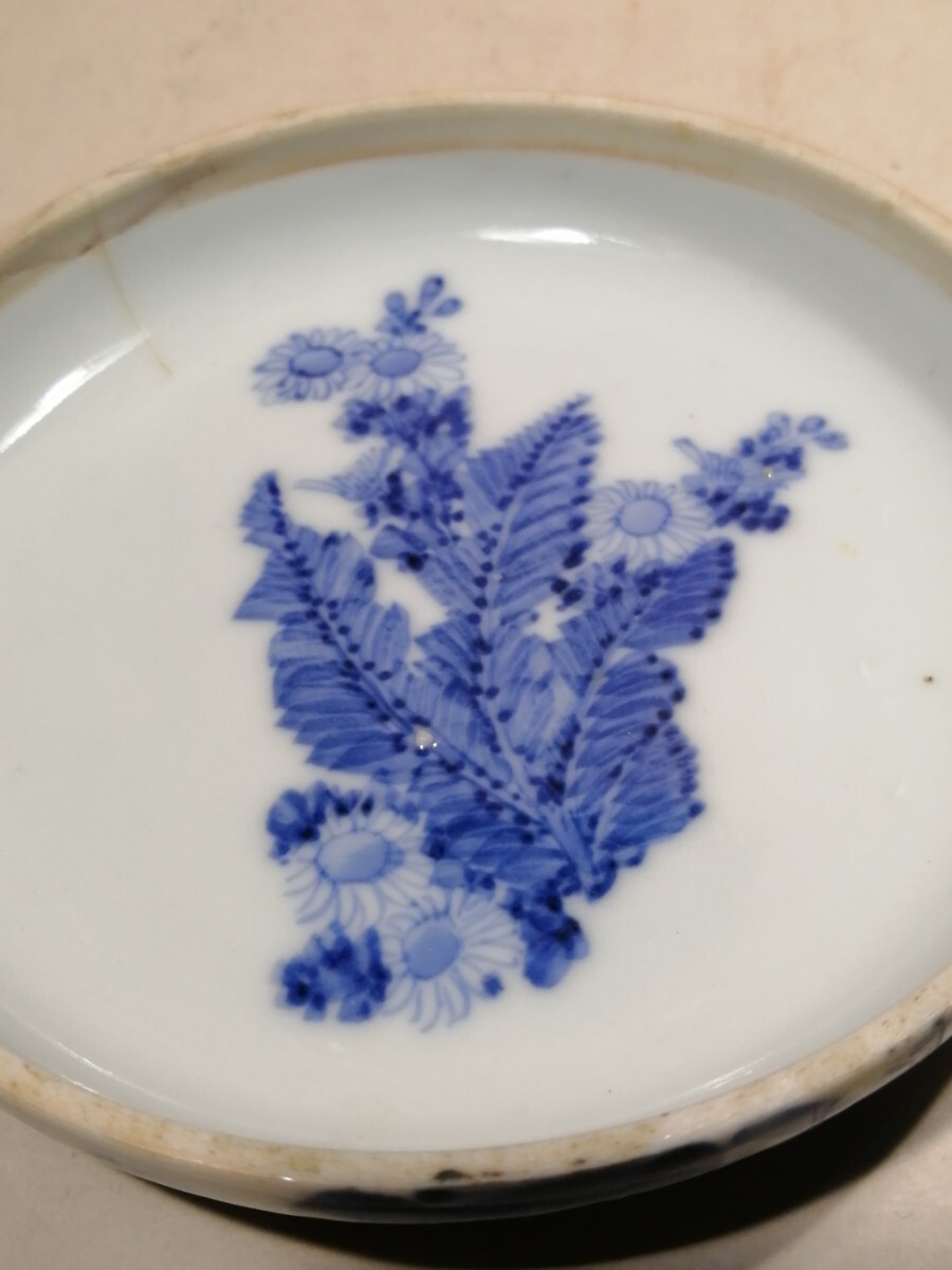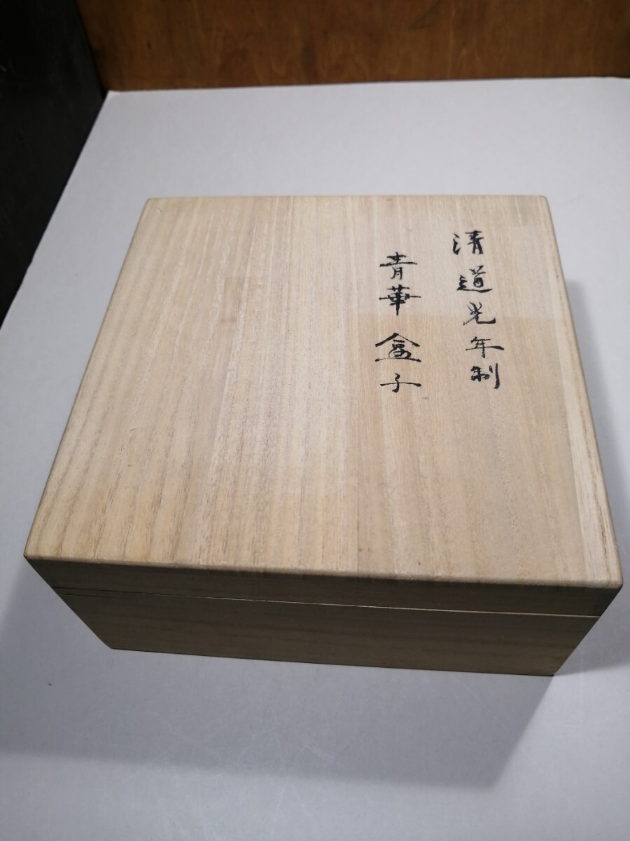 清朝道光の染付の盒子です。蓋には梅に鶯が、見込みには菊の染付があります。上がりの良い清楚な器です。蓋と中子にニューがあります。箱付きです。