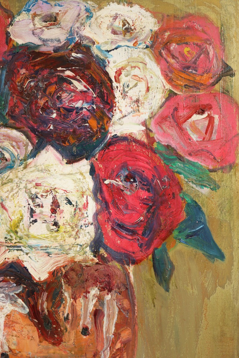 背景や花瓶は控えめに描かれ、バラの美しさが
