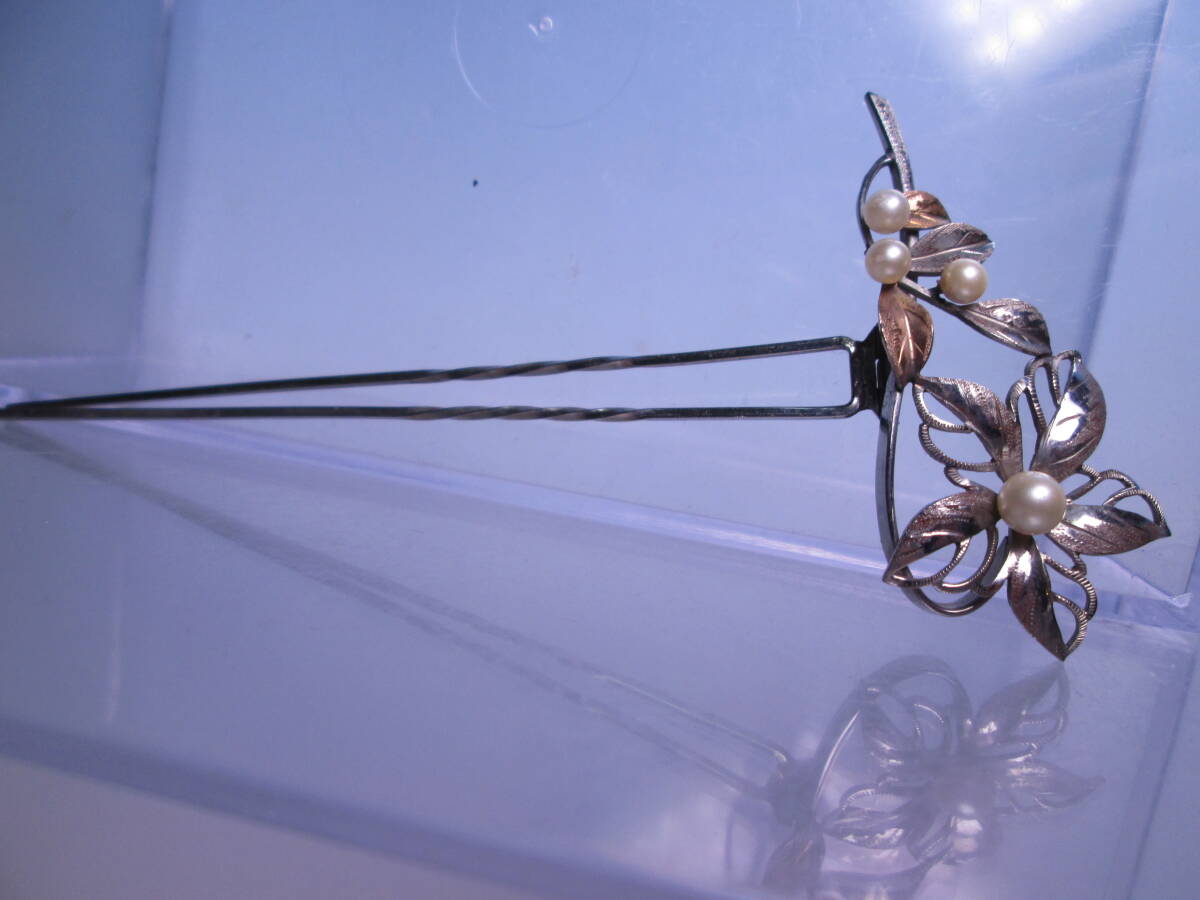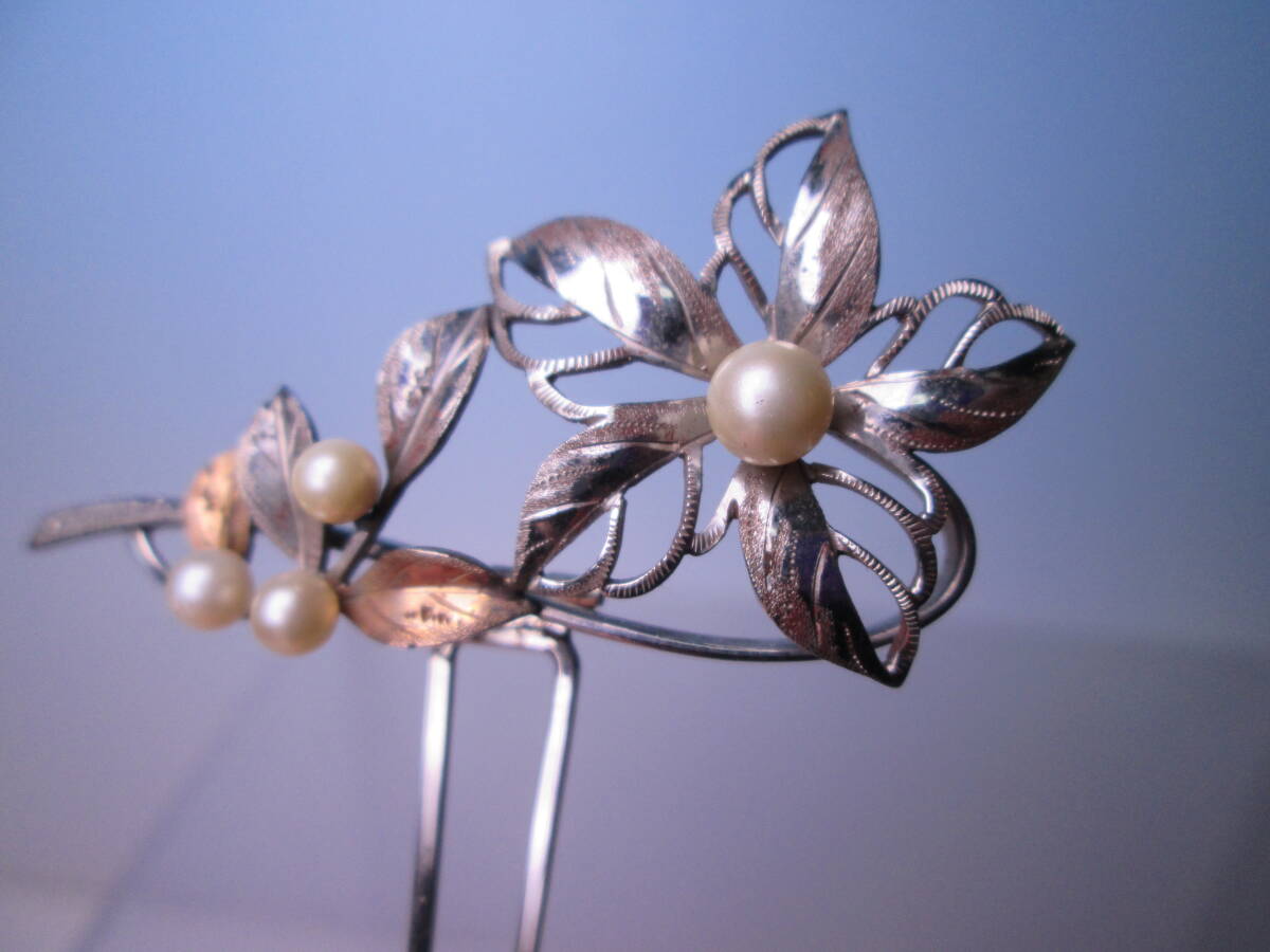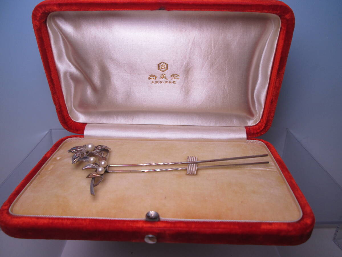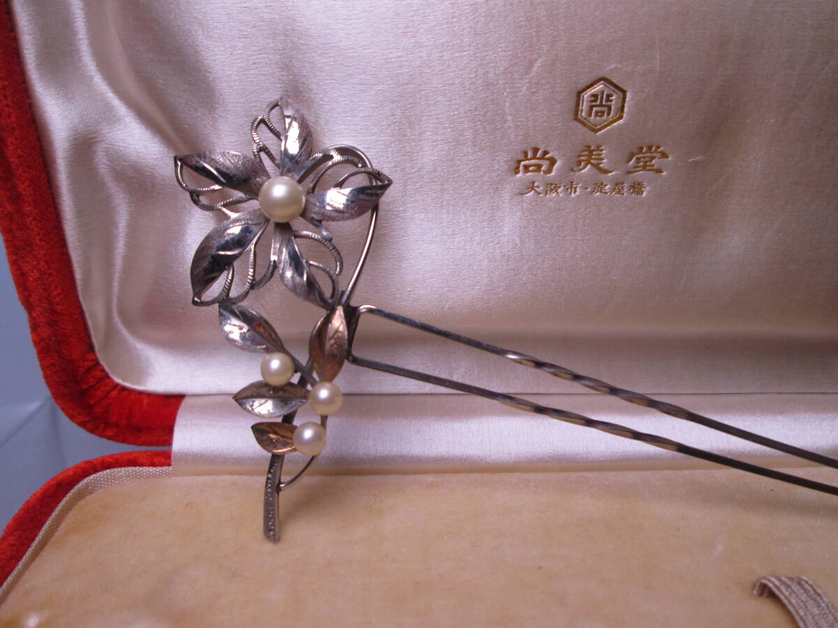 【江月】アンティーク・尚美堂 本真珠飾り 鍍金細工 花のかんざし 共ケース付