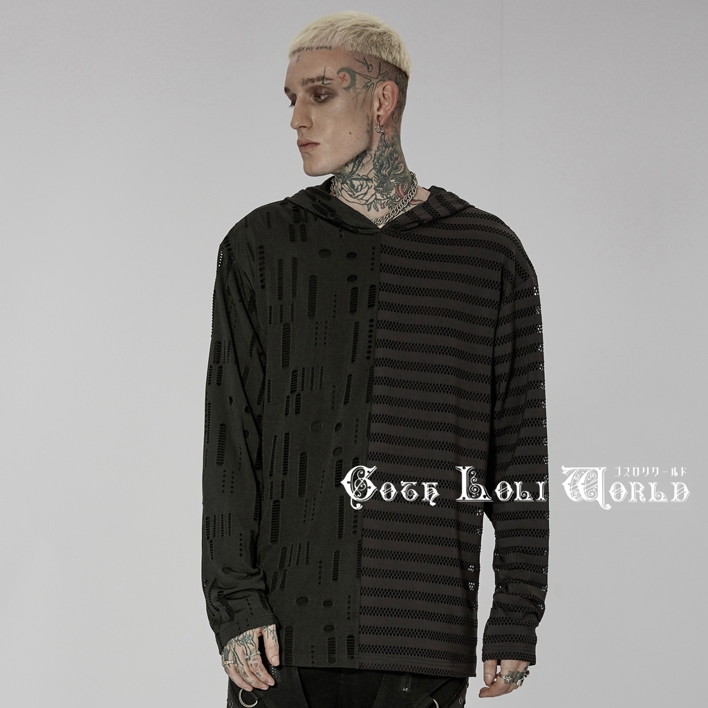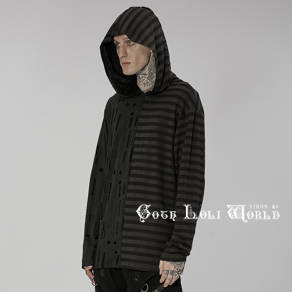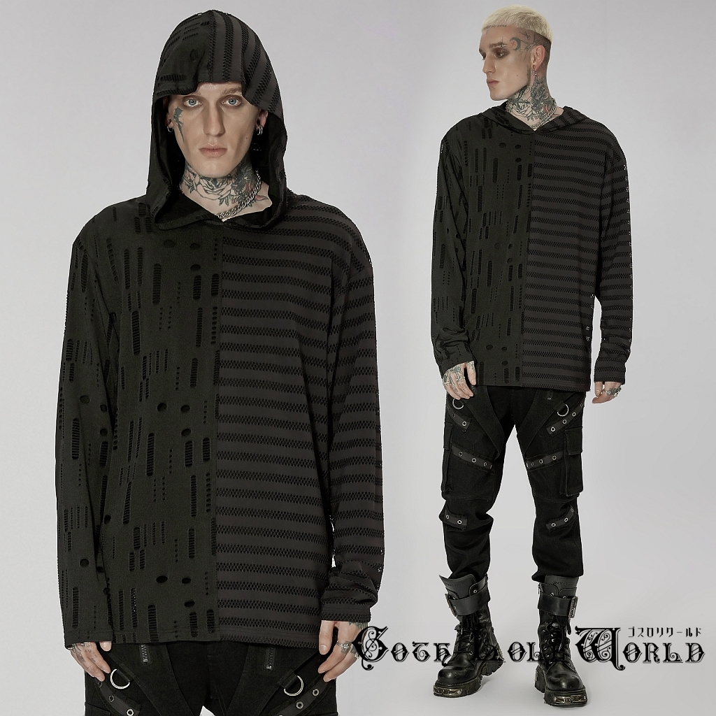 WT-737-S-M メッシュボーダーダメージフード付 カットソー ゴスロリワールド ゴシック パンク ロック ロリィタ ビジュアル系 V系