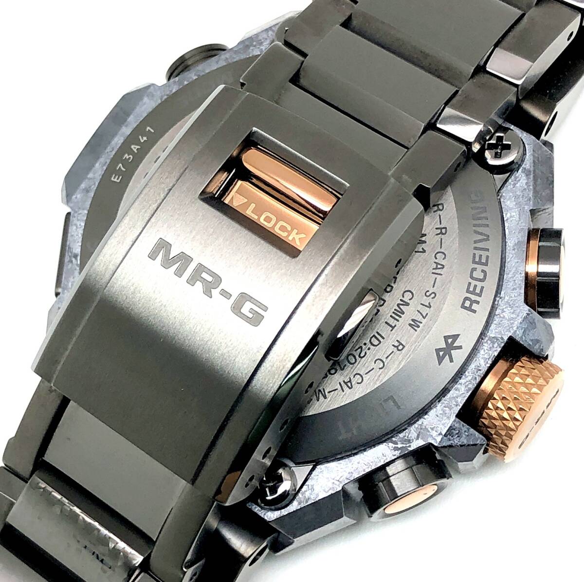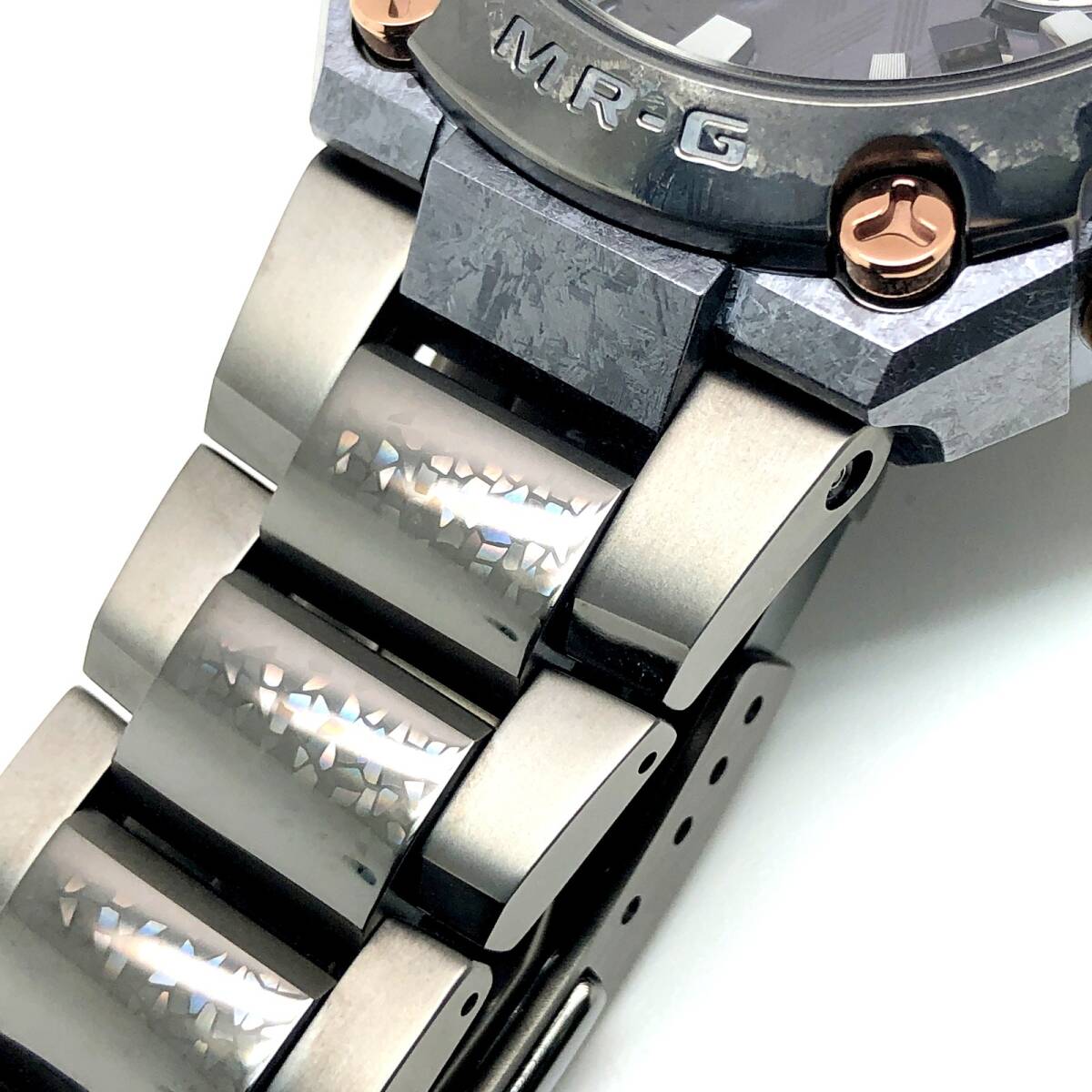 | STAFF COMMENT | 2025年8月国内正規店購入品。ベルトやベゼルに目立たない薄い小傷が見られますが、使用感の無い綺麗な商品です。 付属品:箱・ケース・取扱説明書・保証書・余りコマ×3・刀匠「山上輝平氏の銘切りプレート・MR-G特製組子コースター×2 腕周り:約17.0cm 装着可能サイズ:15.0~20.5cm |