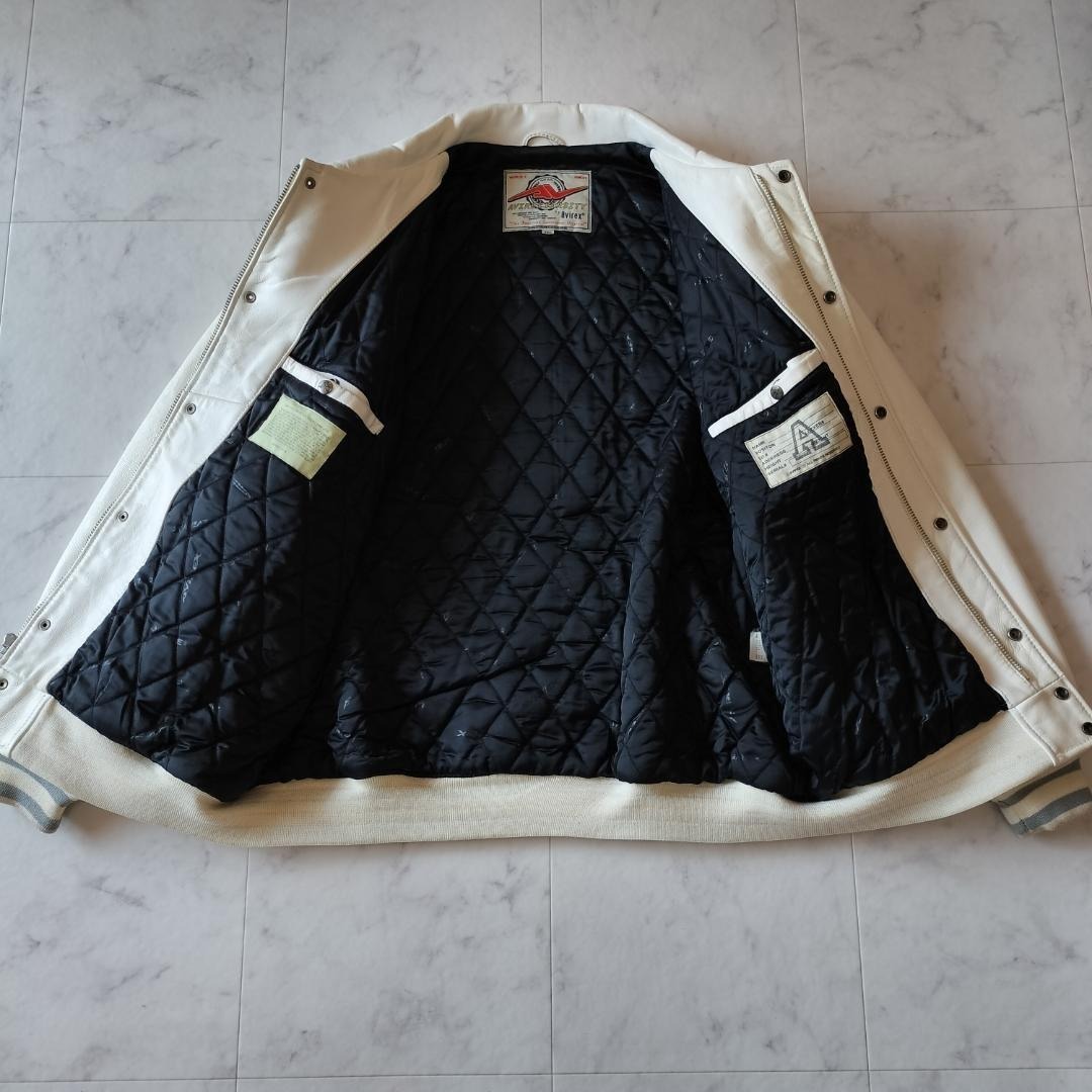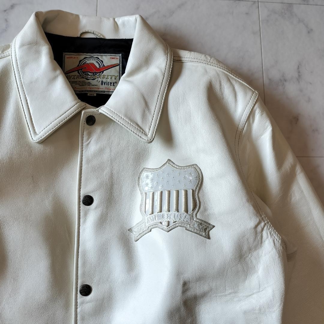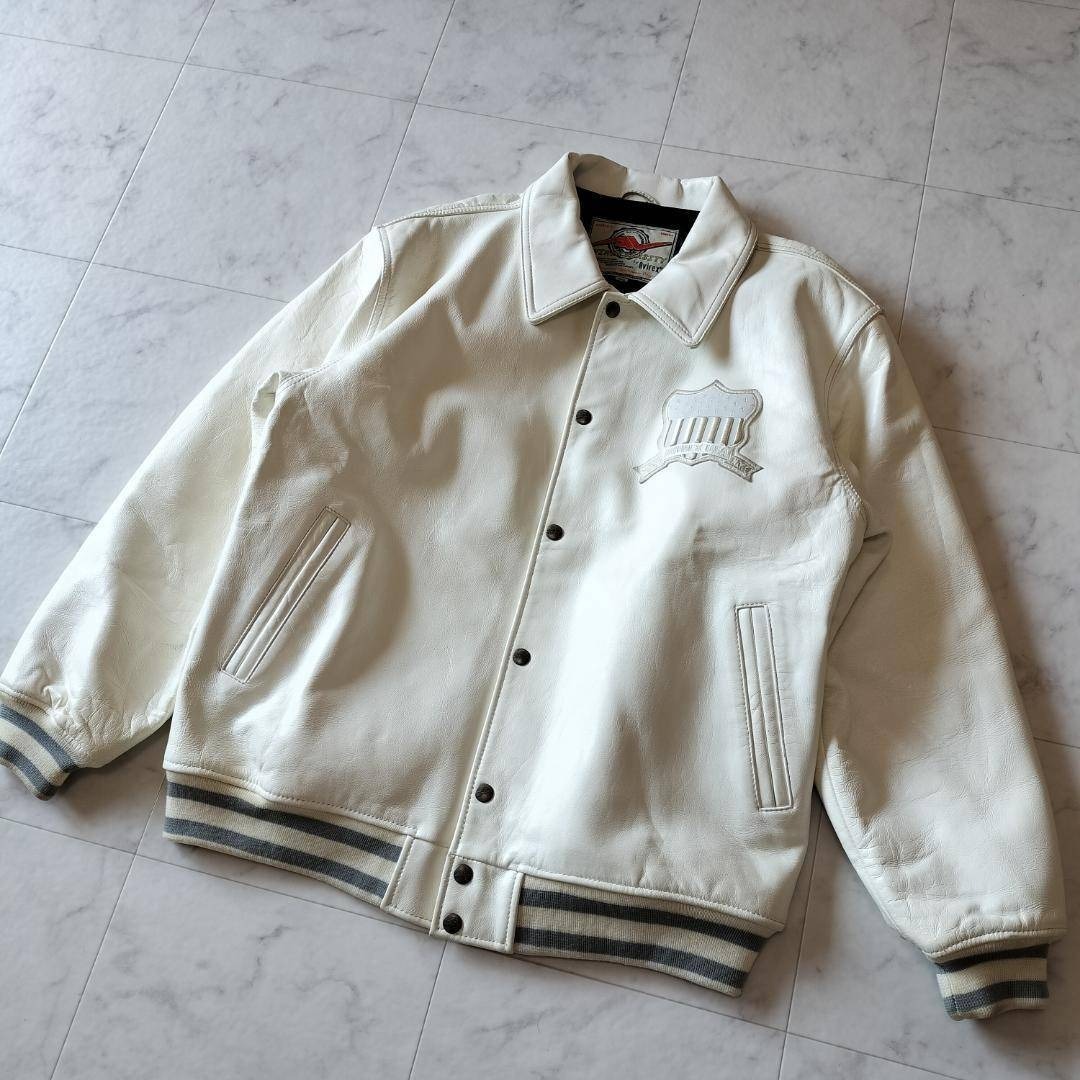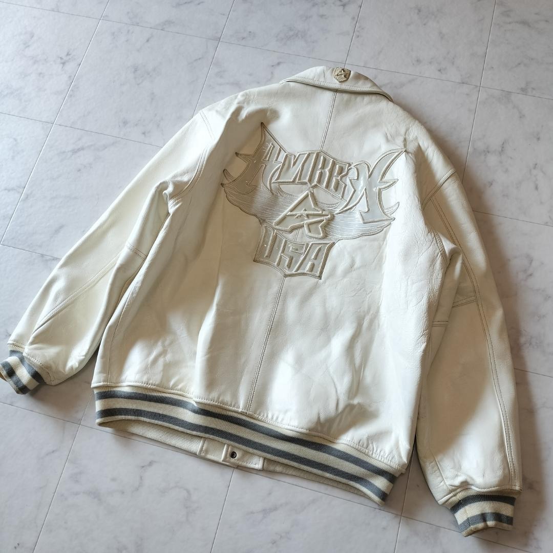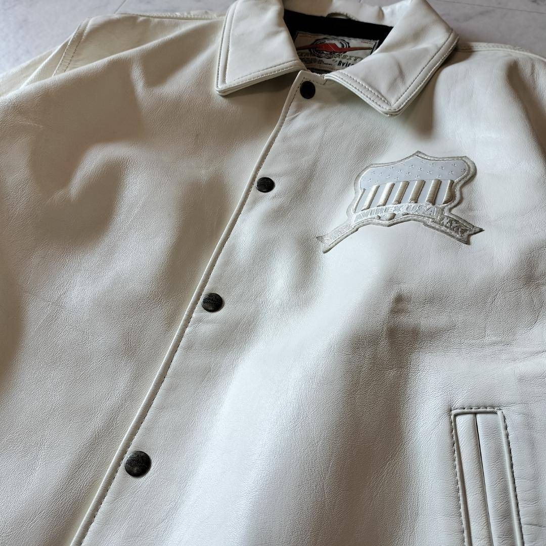 AVIREXの希少なオールレザーバーシティジャケットです。上質な羊革を使用したホワイトカラーの美しい一着で、AVIREXらしいミリタリーテイストとアメカジスタイルが融合したデザインです。