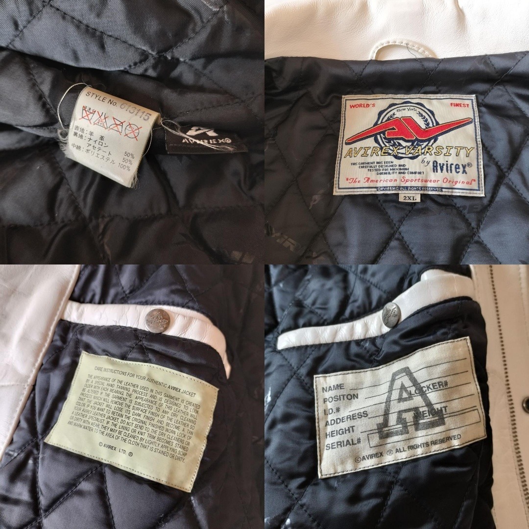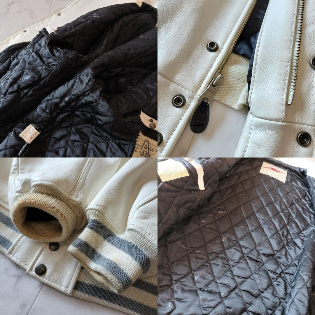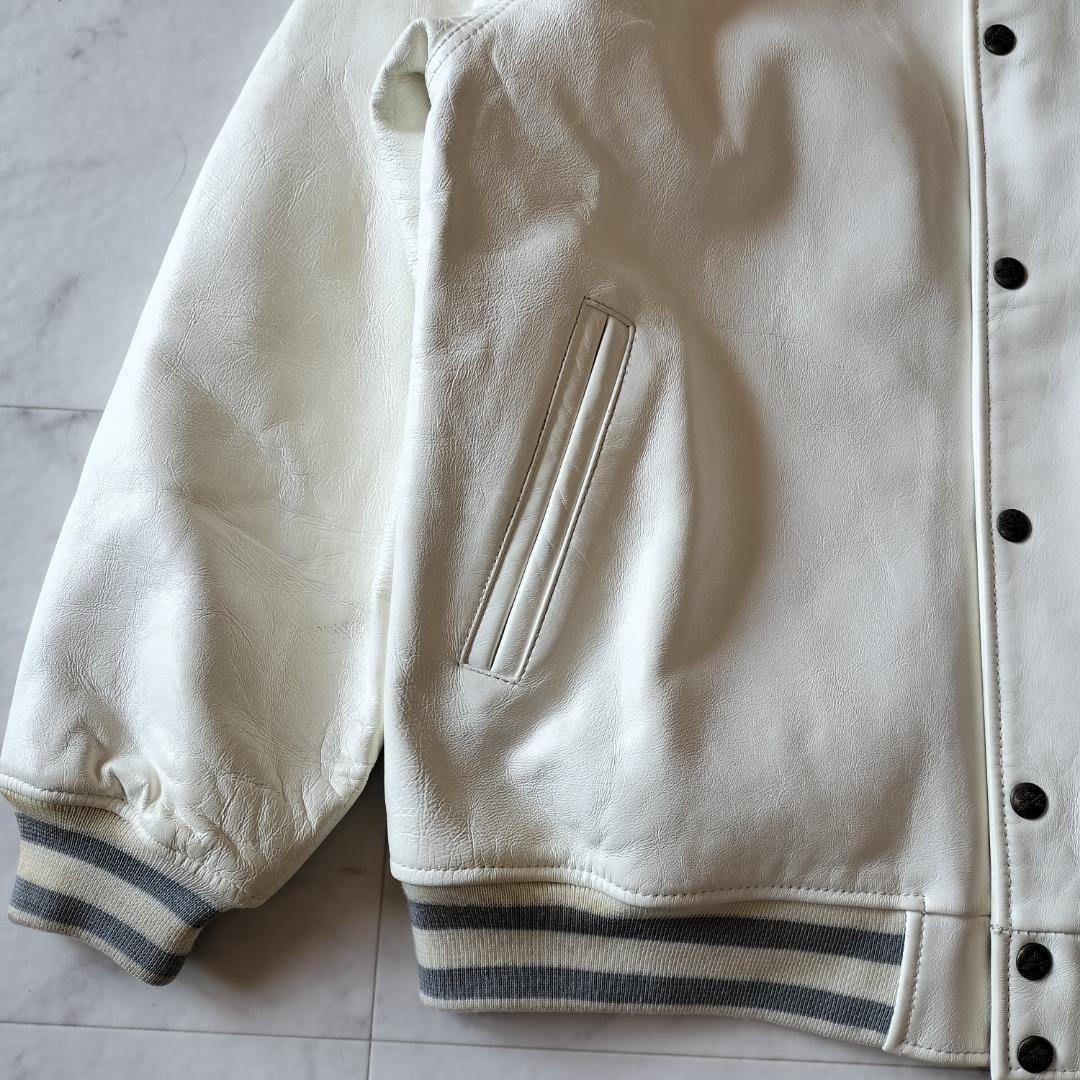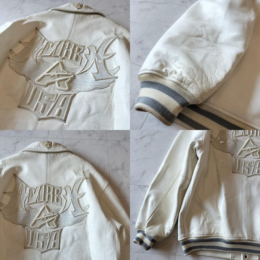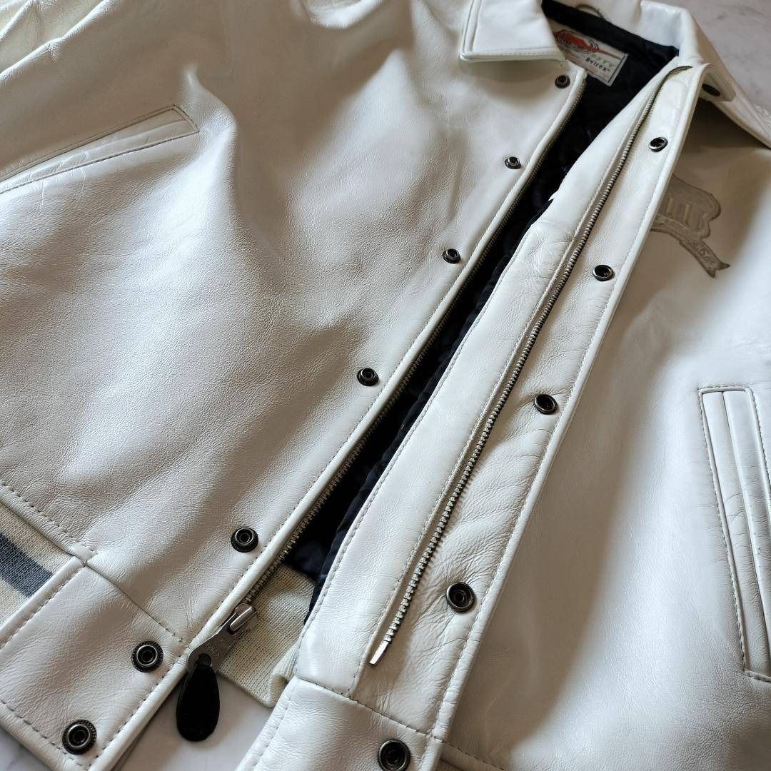 AVIREXの希少なオールレザーバーシティジャケットです。上質な羊革を使用したホワイトカラーの美しい一着で、AVIREXらしいミリタリーテイストとアメカジスタイルが融合したデザインです。