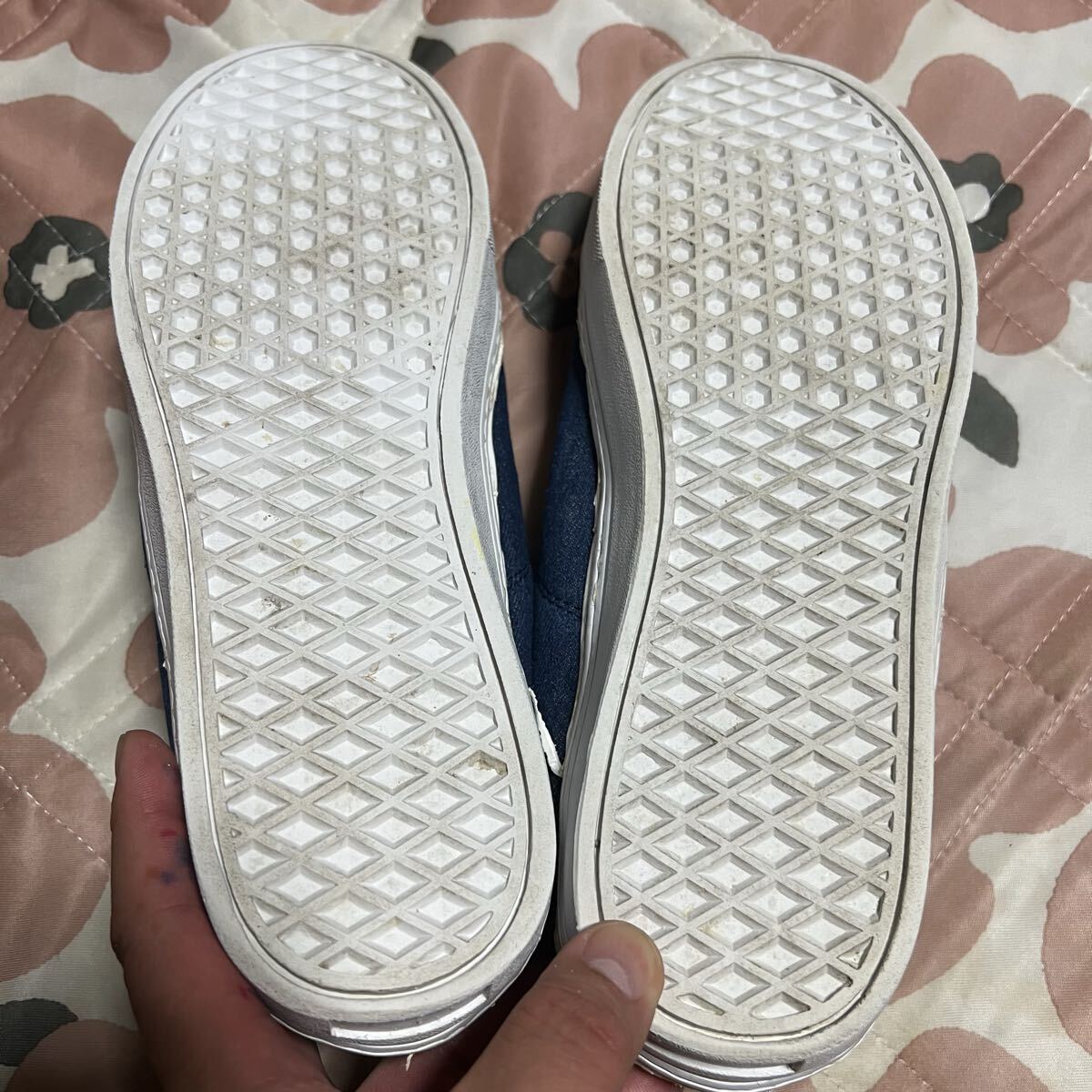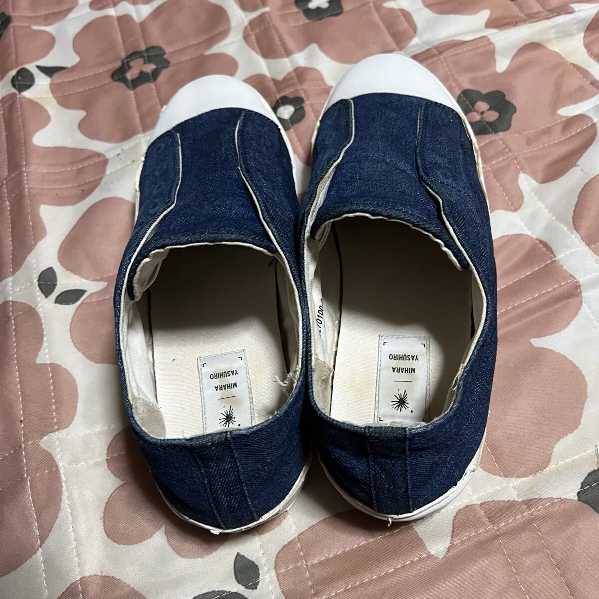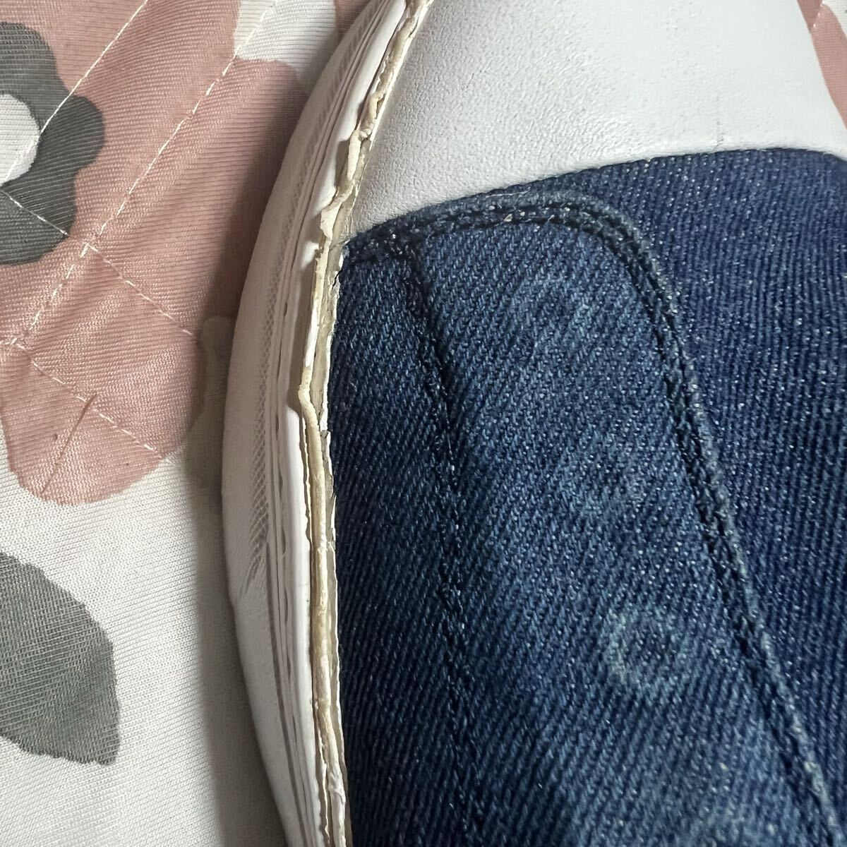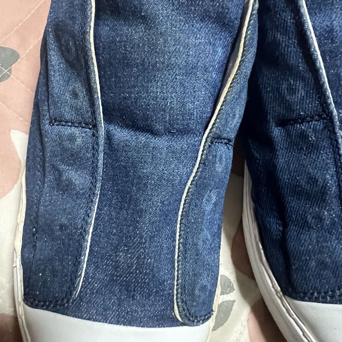 着用に伴い、ソールに使われたウレタン?のエッジの表皮ががボロボロになる仕様ですのでダメージ加工のようなユーズド感があります。またデニム生地には普通の着用感があります。また内部の当て布にほつれがあります。