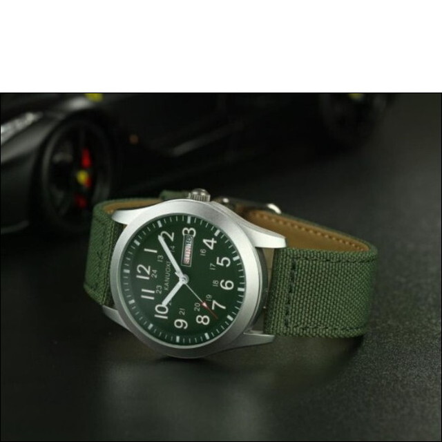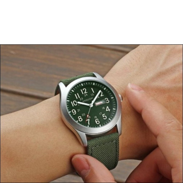 キャンバスベルトで肌触りの良いミリタリーデザインの腕時計です。