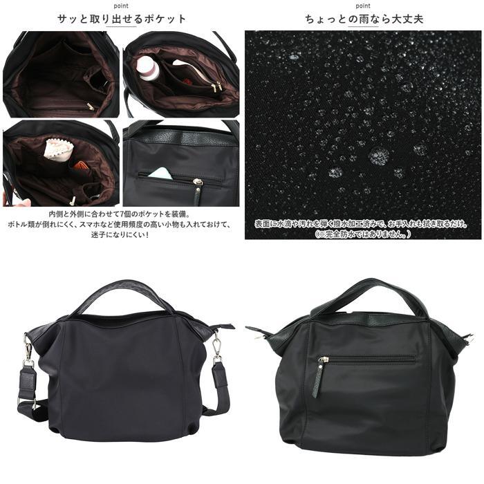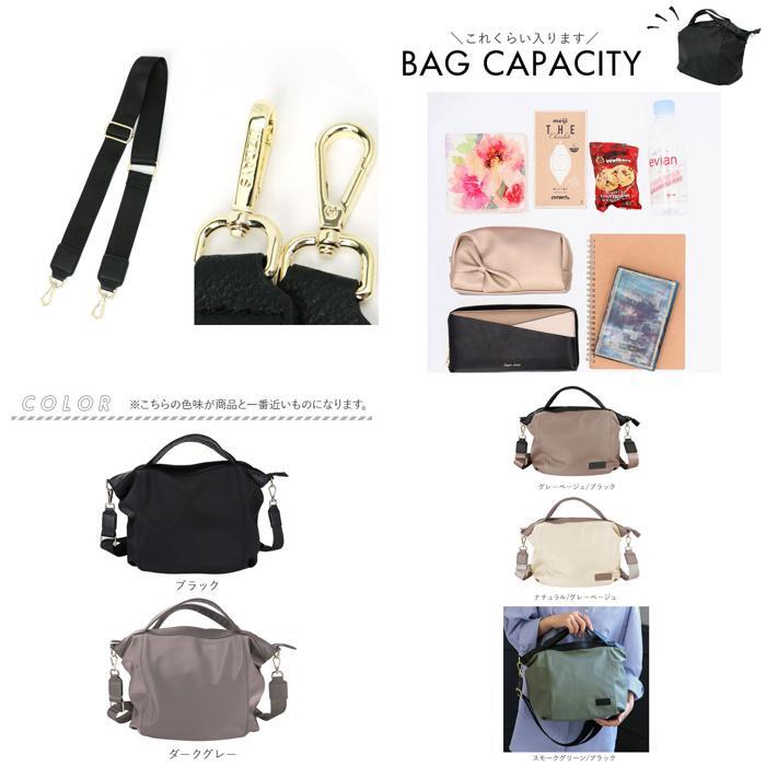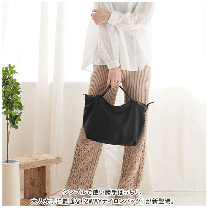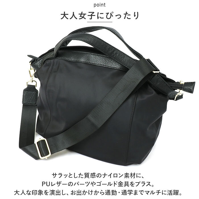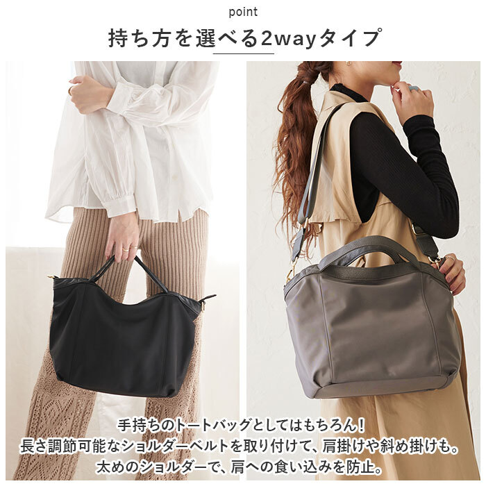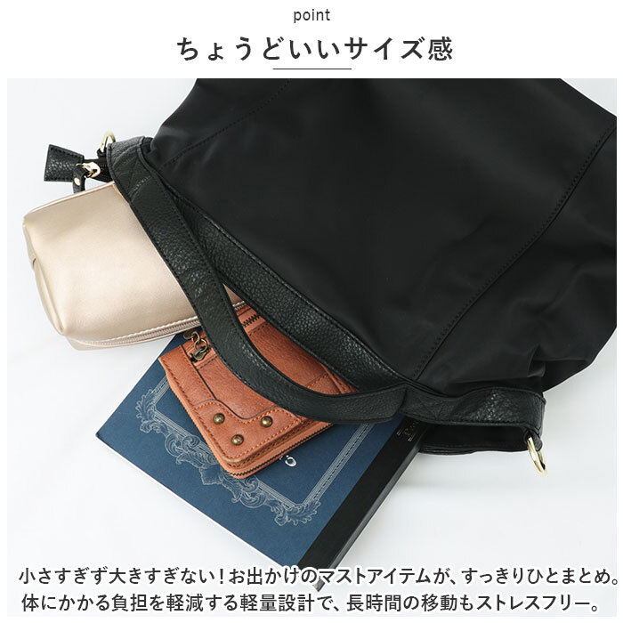 商品説明 | ・・シンプルで使い勝手ばっちり。大人女子に最適な「2WAYナイロンバッグ」が新登場。 ・【大人女子にぴったり】 ・サラッとした質感のナイロン素材に、PUレザーのパーツやゴールド金具をプラス。大人な印象を演出し、お出かけから通勤・通学までマルチに活躍。 ・【持ち方を選べる2wayタイプ】 ・手持ちのトートバッグとしてはもちろん!長さ調節可能なショルダーベルトを取り付けて、肩掛けや斜め掛けも。太めのショルダーで、肩への食い込みを防止。 ・【ちょうどいいサイズ感】 ・小さすぎず大きすぎない!お出かけのマストアイテムが、すっきりひとまとめ。体にかかる負担を軽減する軽量設計で、長時間の移動もストレスフリー。 ・【安心の天ファスナー開口】 ・開口部は天ファスナー式。ガバっと開いて取り出しやすく、ファスナーを閉めればプライバシーを確保。 ・【B5対応サイズ】 ・内側はB5サイズのノートが横向きにすっぽり。マチもしっかり設け、コスメポーチやドリンクボトル、薄手の羽織りなどもざっくりと収納可能。 ・【サッと取り出せるポケット】 ・内側と外側に合わせて7個のポケットを装備。ボトル類が倒れにくく、スマホなど使用頻度の高い小物も入れておけて、迷子になりにくい! ・【ちょっとの雨なら大丈夫】 ・表面に水滴や汚れを弾く撥水加工済みで、お手入れも拭き取るだけ。(※完全防水ではありません。) ・【お気に入りをチョイス】 ・コーデに馴染みやすい、落ち着きのあるカラーをラインナップ。年代問わず持ちやすいデザインも魅力。 ・【ポケット仕様】 ・内側:ファスナーポケット×2、オープンポケット×3、ボトルポケット×1 ・背面:ファスナーポケット×1 |