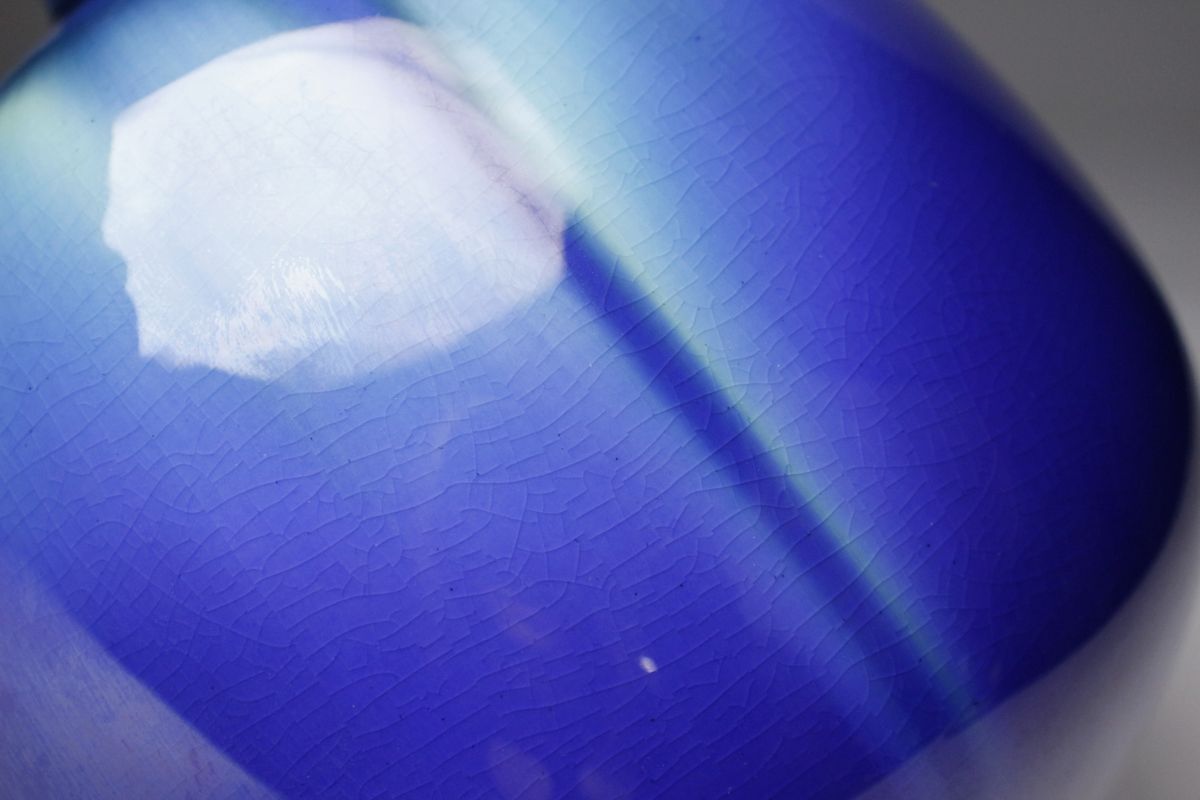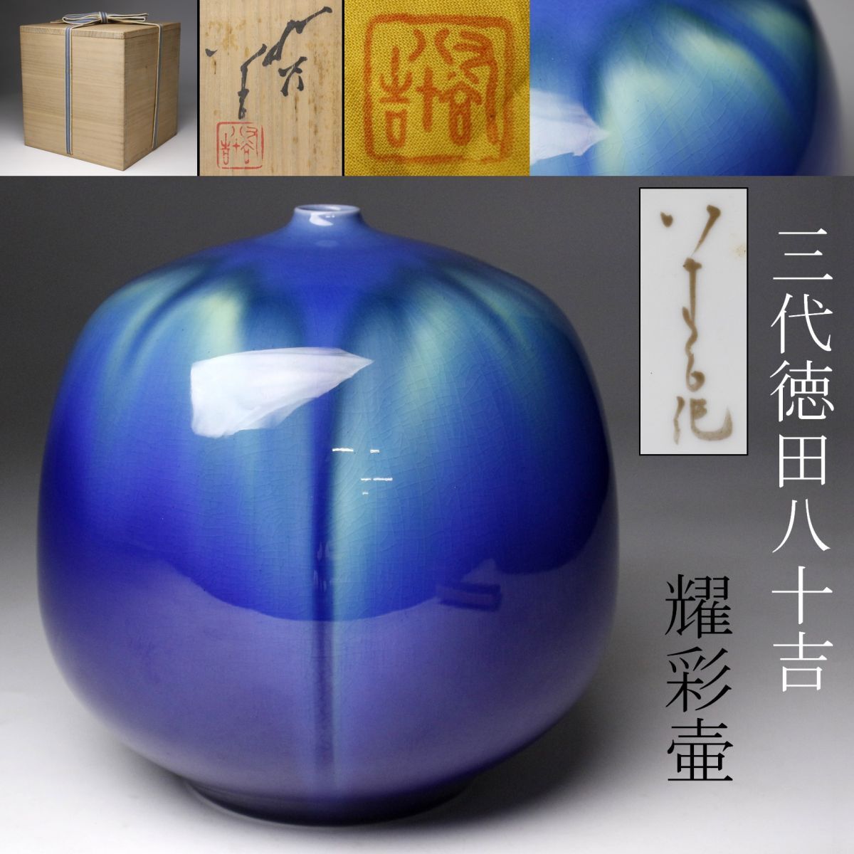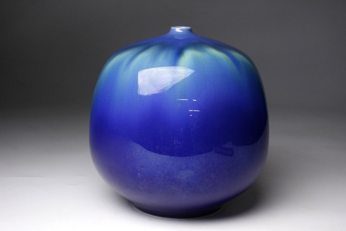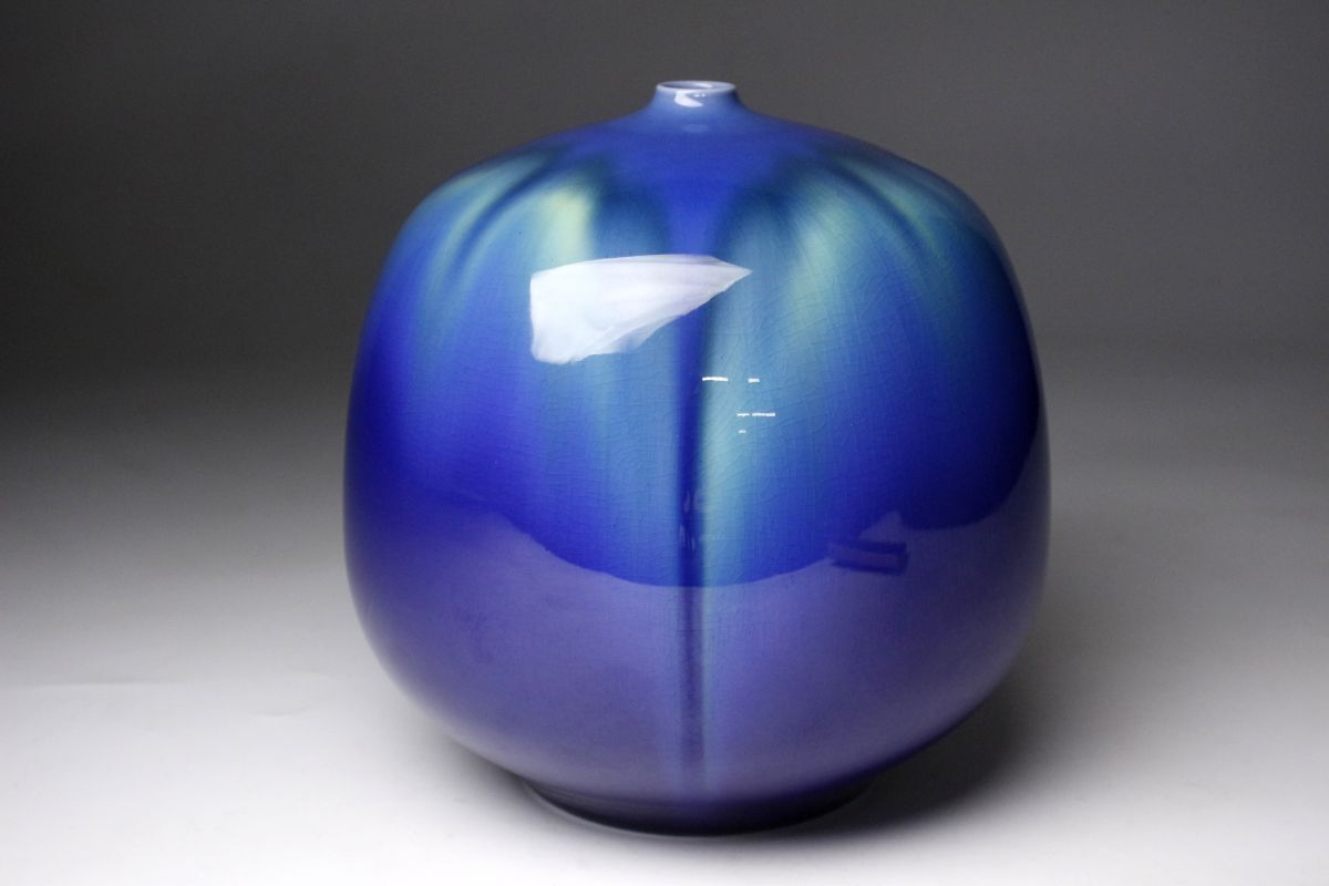 正に光り輝くような魅惑的な色彩を放つ三代徳田八十吉による耀彩壷のご紹介です。 全長は17㎝と小振りで、丸い造形からは愛らしさも感じられます。 混ざり合うよう直線的に垂れる釉薬の表情も素晴らしく、その様は神秘的で荘厳ささえあります。 複雑に絡み合う色彩に目を奪われる、作家の高い美意識が凝縮された素晴らしい逸品を この機会に是非お手元にてご堪能下さい。 作家略歴 三代目 徳田八十吉(とくだ やそきち 1933 - 2009 ) 初代の孫として石川県に生まれる。 金沢美術工芸大学短期大学工芸科陶磁専攻中退後に、初代、二代目等に師事。 1988年に三代目を襲名し、1991年には第11回日本陶芸展で、大賞・秩父宮賜杯を受賞した。 1997年6月6日、重要無形文化財「彩釉磁器」の保持者(人間国宝)に認定される。 釉薬で色彩を調整した鮮やかな群青色に強い個性がある。 海外にも多くの作品を発表して高い評価を得た。