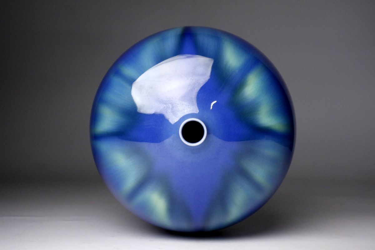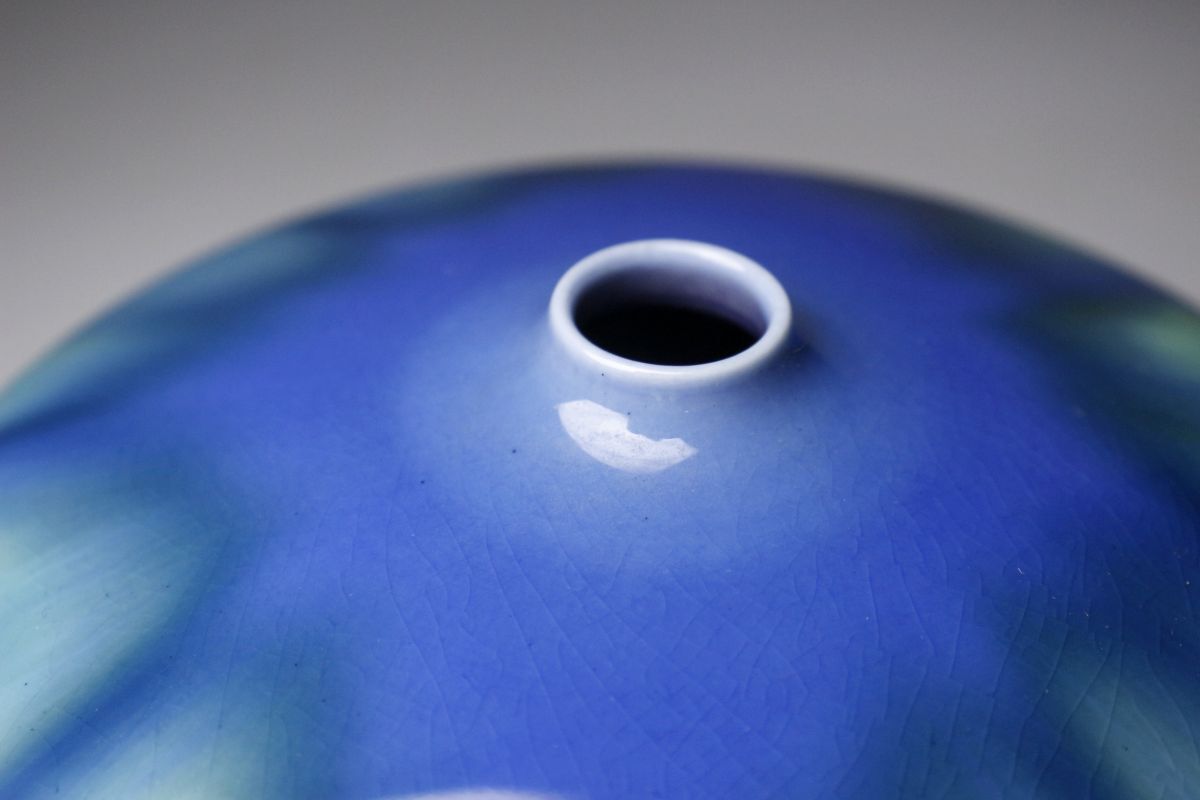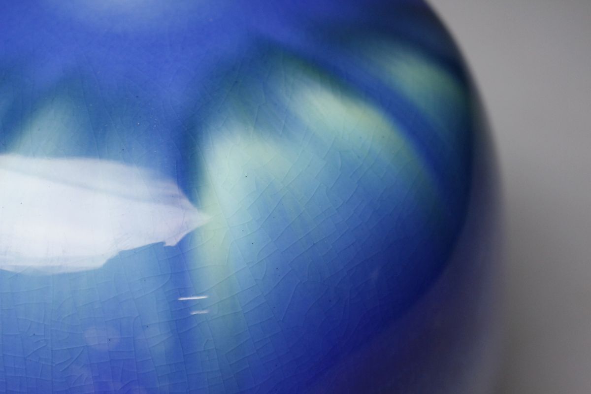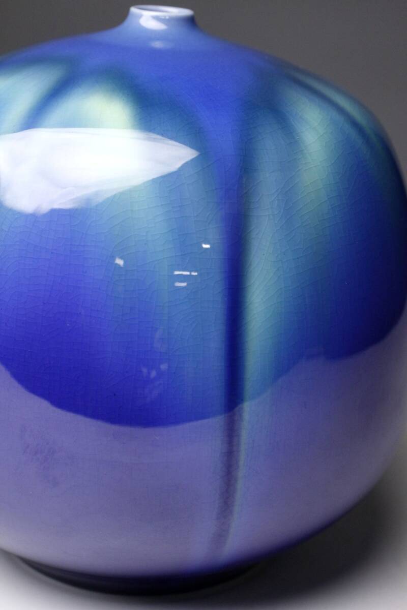正に光り輝くような魅惑的な色彩を放つ三代徳田八十吉による耀彩壷のご紹介です。 全長は17㎝と小振りで、丸い造形からは愛らしさも感じられます。 混ざり合うよう直線的に垂れる釉薬の表情も素晴らしく、その様は神秘的で荘厳ささえあります。 複雑に絡み合う色彩に目を奪われる、作家の高い美意識が凝縮された素晴らしい逸品を この機会に是非お手元にてご堪能下さい。 作家略歴 三代目 徳田八十吉(とくだ やそきち 1933 - 2009 ) 初代の孫として石川県に生まれる。 金沢美術工芸大学短期大学工芸科陶磁専攻中退後に、初代、二代目等に師事。 1988年に三代目を襲名し、1991年には第11回日本陶芸展で、大賞・秩父宮賜杯を受賞した。 1997年6月6日、重要無形文化財「彩釉磁器」の保持者(人間国宝)に認定される。 釉薬で色彩を調整した鮮やかな群青色に強い個性がある。 海外にも多くの作品を発表して高い評価を得た。