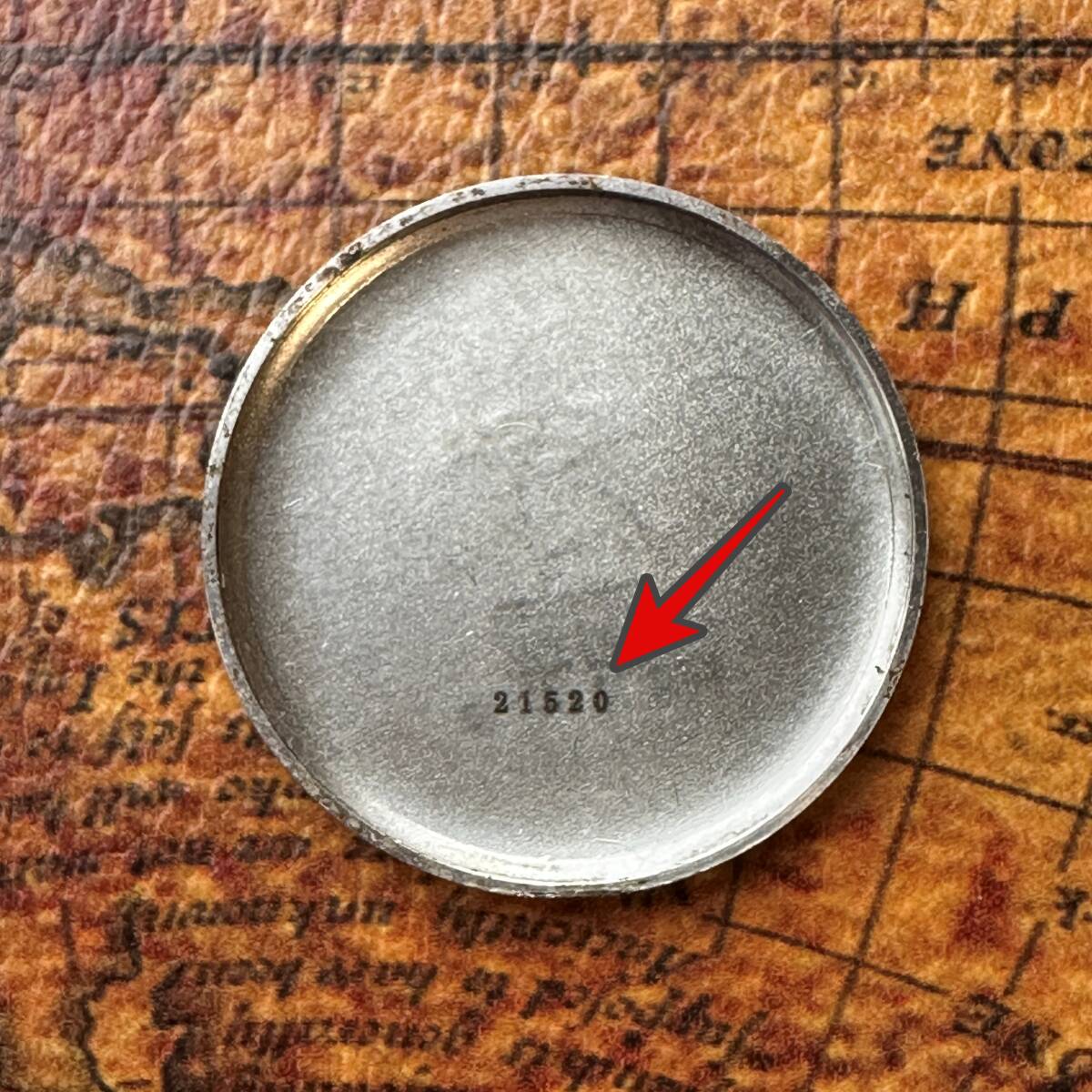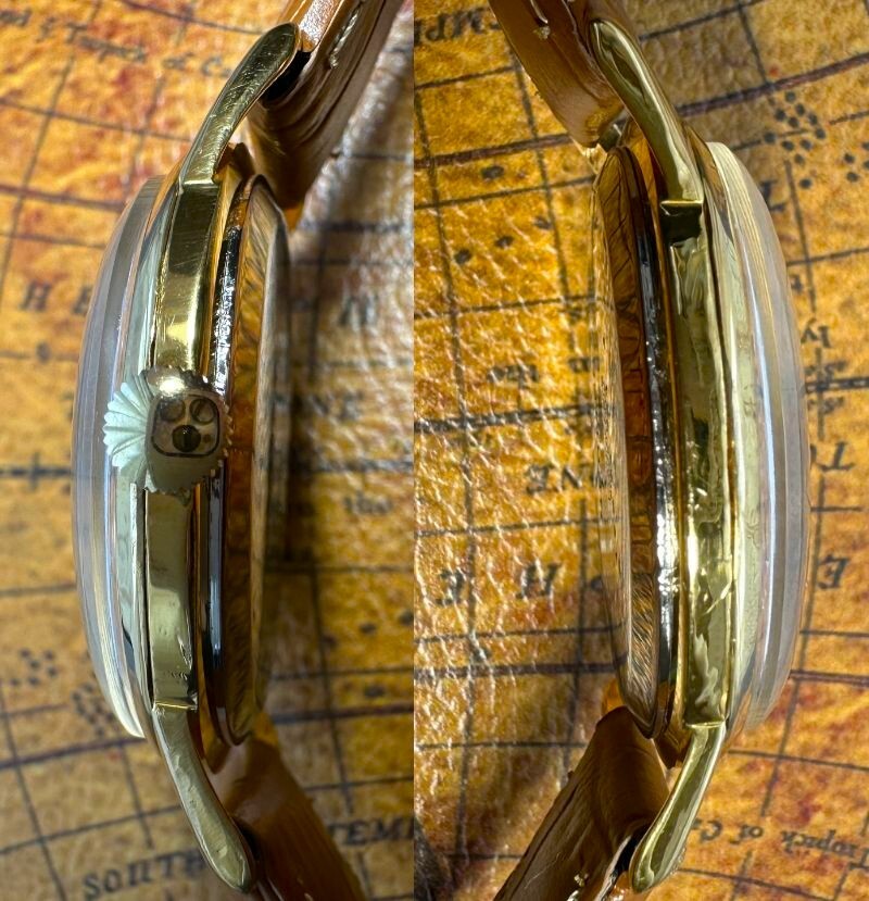 ケースはゴールドプレート仕様で、落ち着いた輝きが魅力。サイズは約36mmと、当時のドレスウォッチとしては存在感があり、スーツにもカジュアルにも自然に馴染みます。裏蓋とムーブメントに刻印された「21520」が一致します。