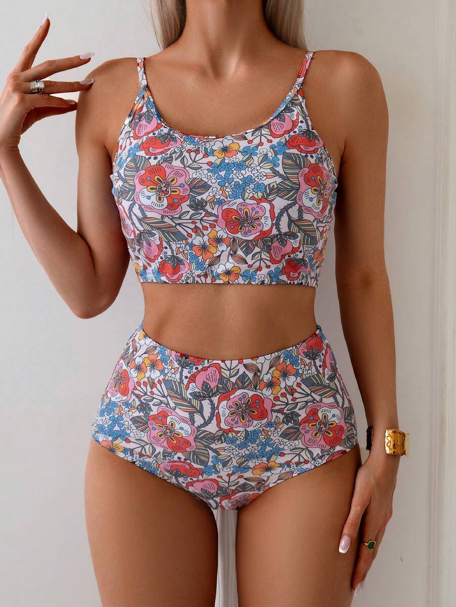 レディース 水着 ビキニセット ランダムプリント タンキニセット 夏のビーチバケーション用 2ピースセット ハイウエスト水着