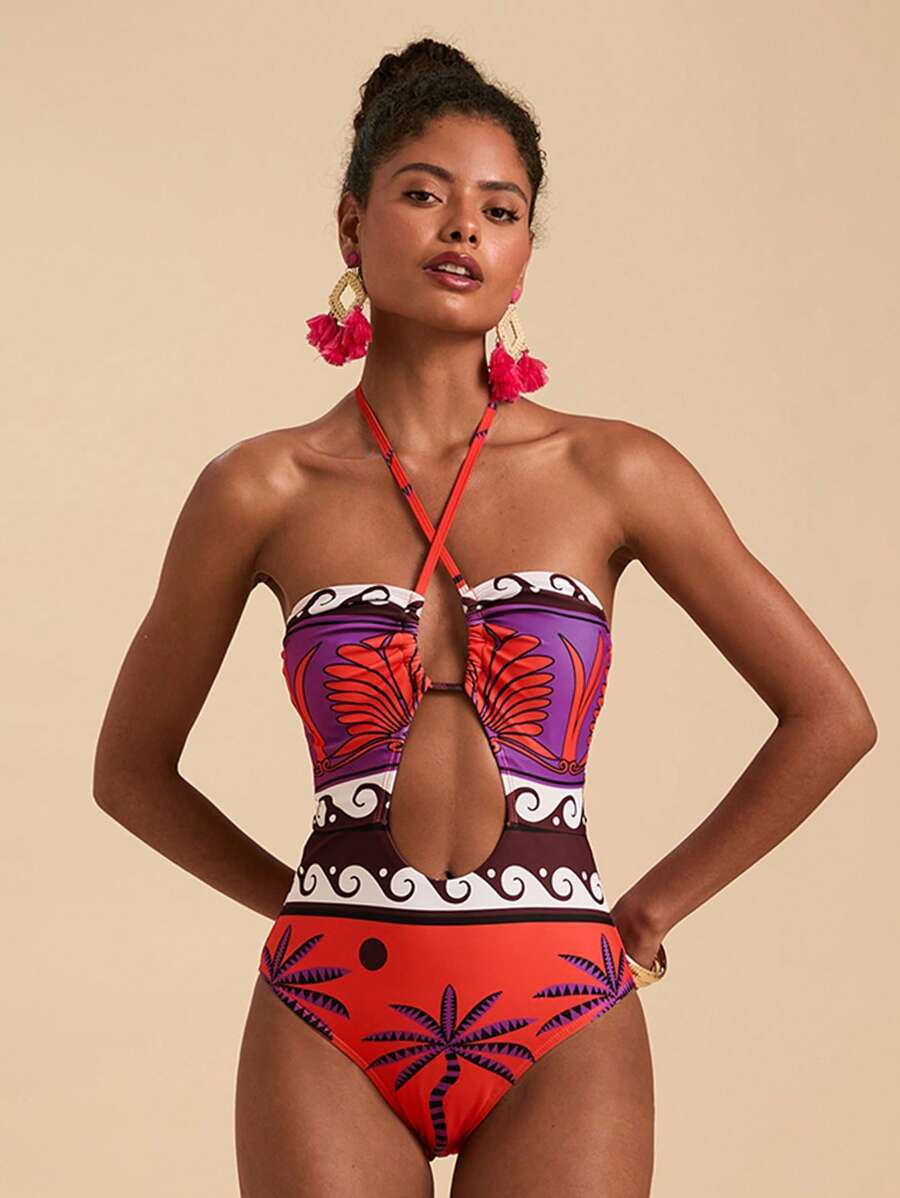レディース 水着 ワンピース 女性用オールオーバープリントホロー ホルターワンピース水着、女性夏用アウトフィット、女性用水着、女性