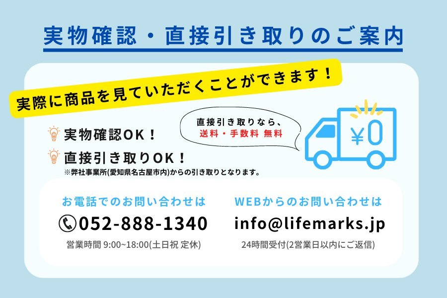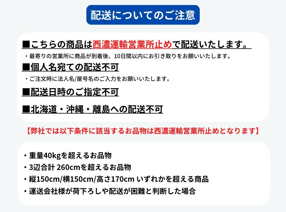 | 送料・配送について | ■送料について こちらの商品は別途送料がかかります。 送料はご注文時に送信される自動配信メールの金額とは異なります。 ご注文時に決済を完了されている場合、決済後に金額変更の処理をさせていただきます。 送料を含む合計金額については弊社より別途メールにてご案内いたしますのでご確認ください。 銀行振込にてお支払いの場合、合計金額のご案内後にお支払い手続きをお願いいたします。 事前にお見積りをご希望のお客様は、ご購入前にお問い合わせください。 ■配送について ご入金の確認から、7営業日以内に配送のお手続きをいたします。 こちらの商品は西濃運輸営業所止めでの配送となります。 着店から10日間以内に、お客様ご自身で営業所からのお引き取りをお願いいたします。 ※お引き取りできなかった場合、再配達料がかかります。 ※北海道・沖縄・離島・個人名宛てへの配送は承ることができませんので、ご了承ください。 ※代引き・日時指定についても承ることができません。 |