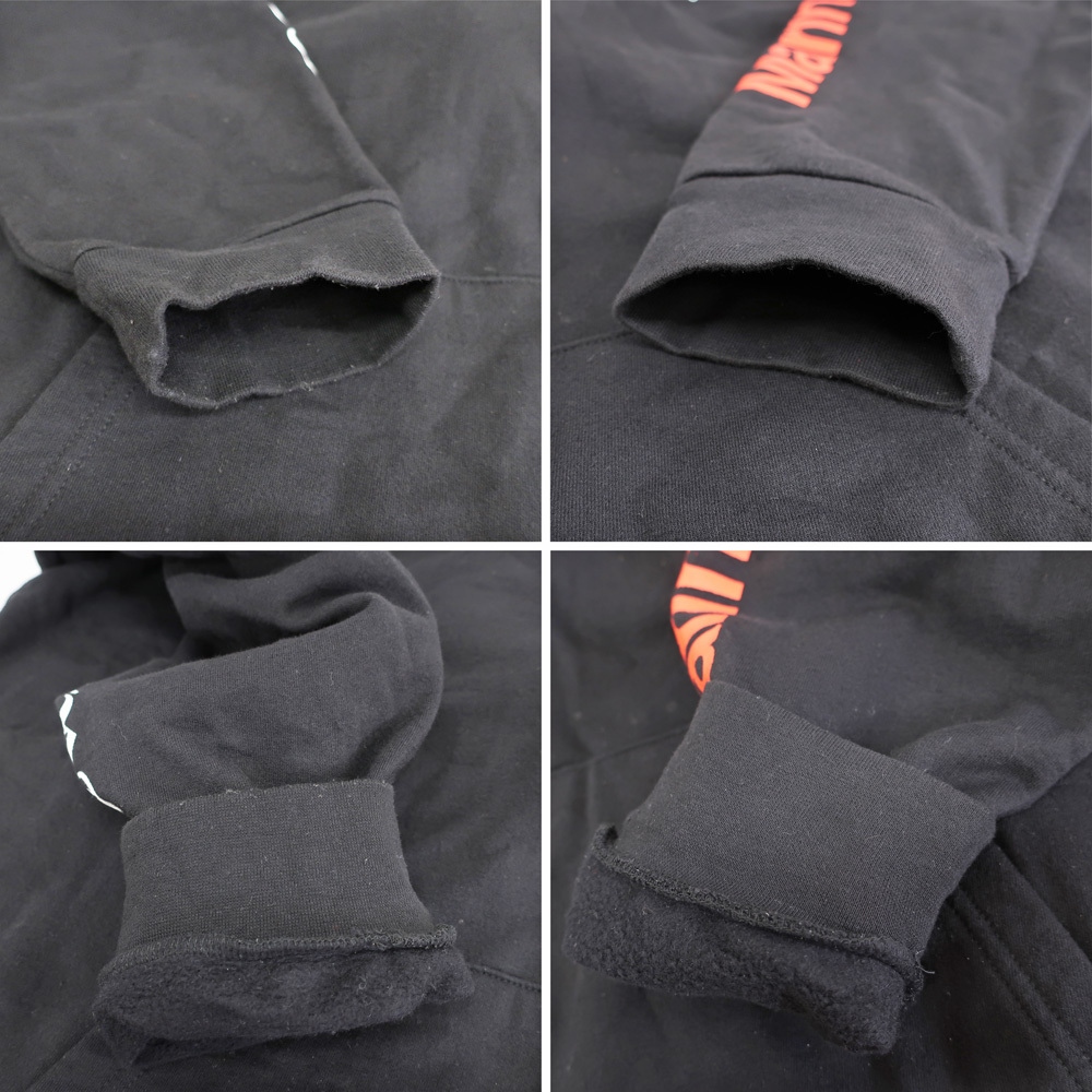 全体的に毛羽立ちや毛玉感、リブ部にヨレや毛玉、細かい繊維の付着、紐に毛羽立ち、