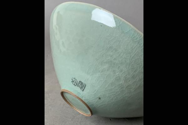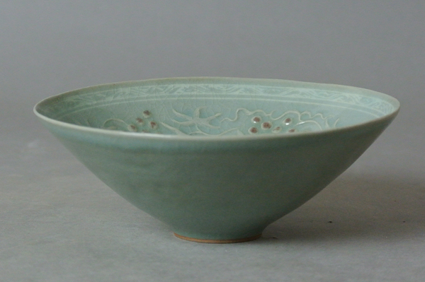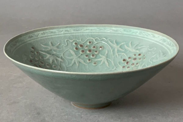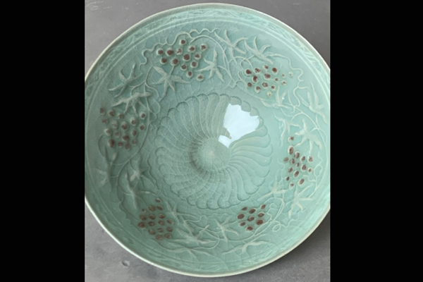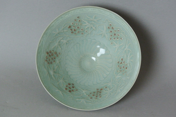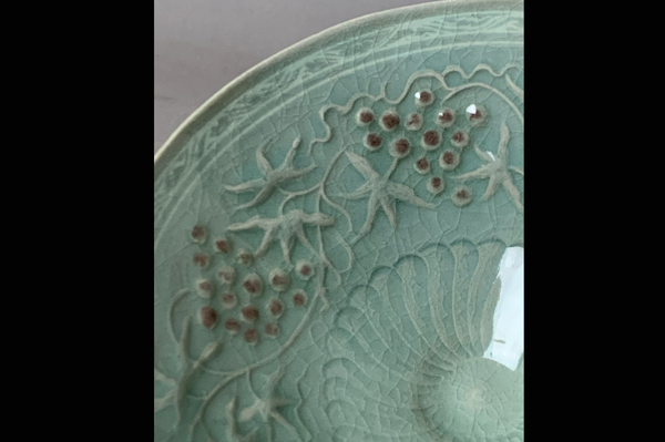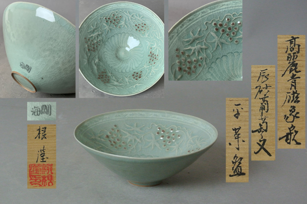 【 柳海剛 高麗青磁 象嵌 辰砂 葡萄文 平茶碗 共箱・栞付き】 |