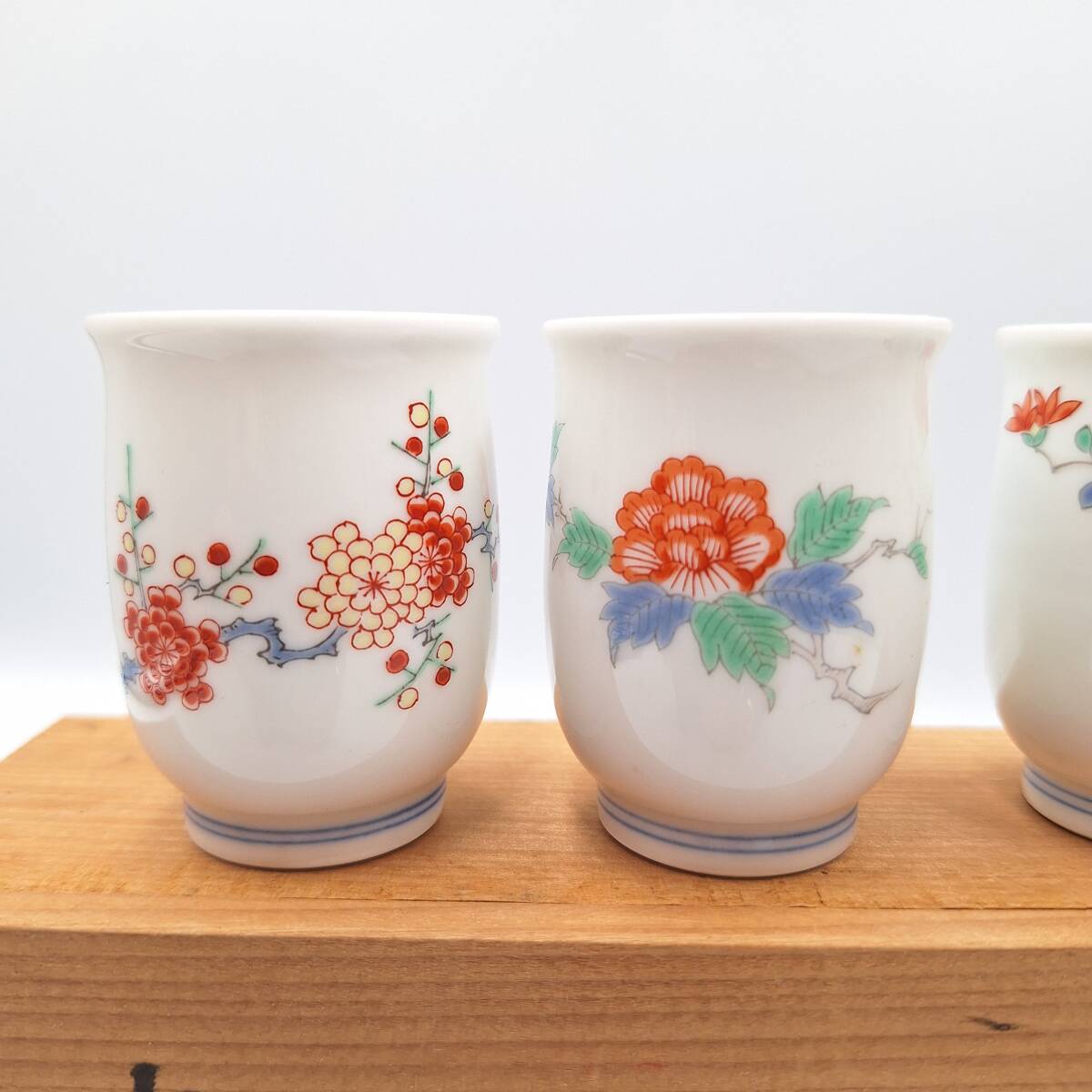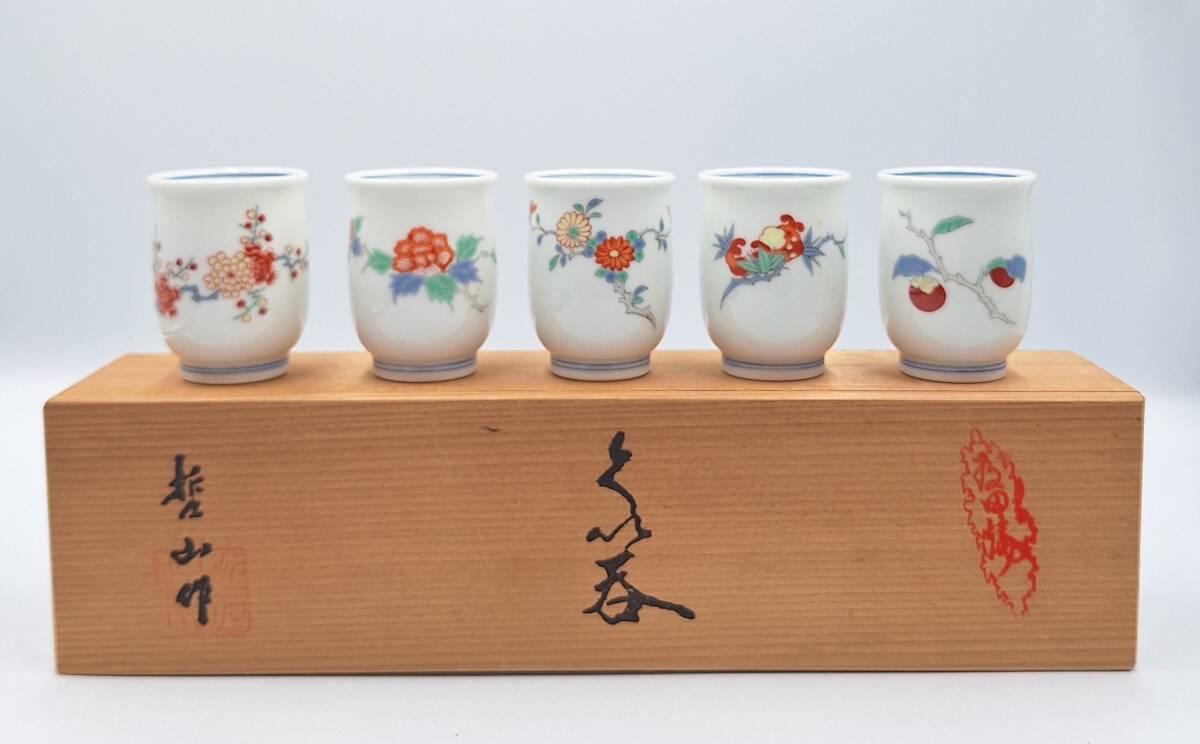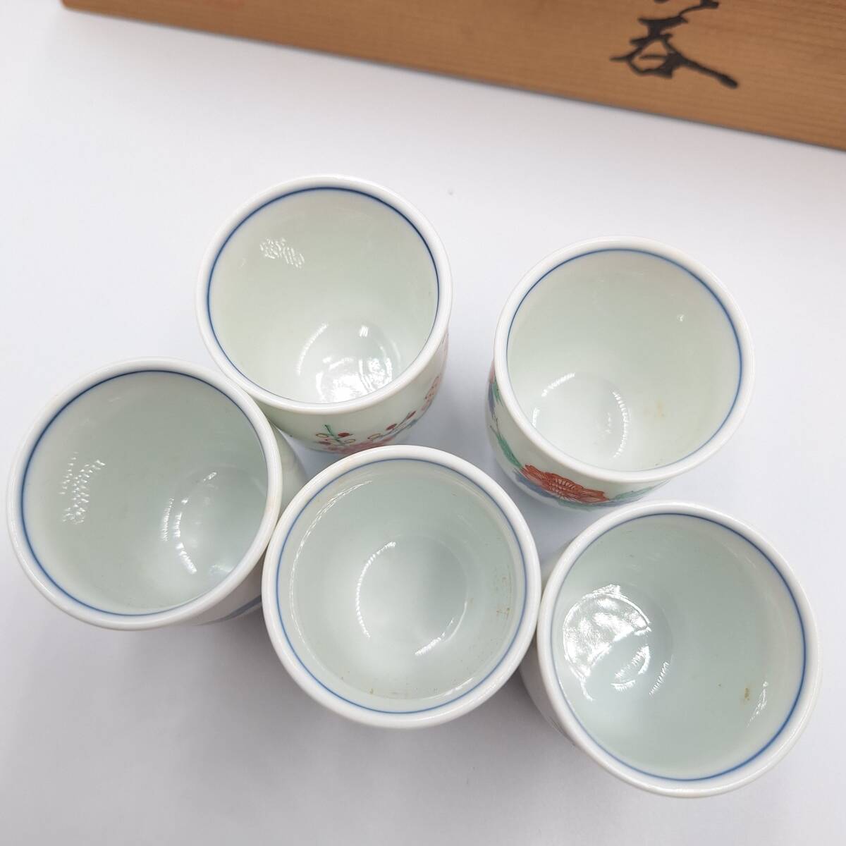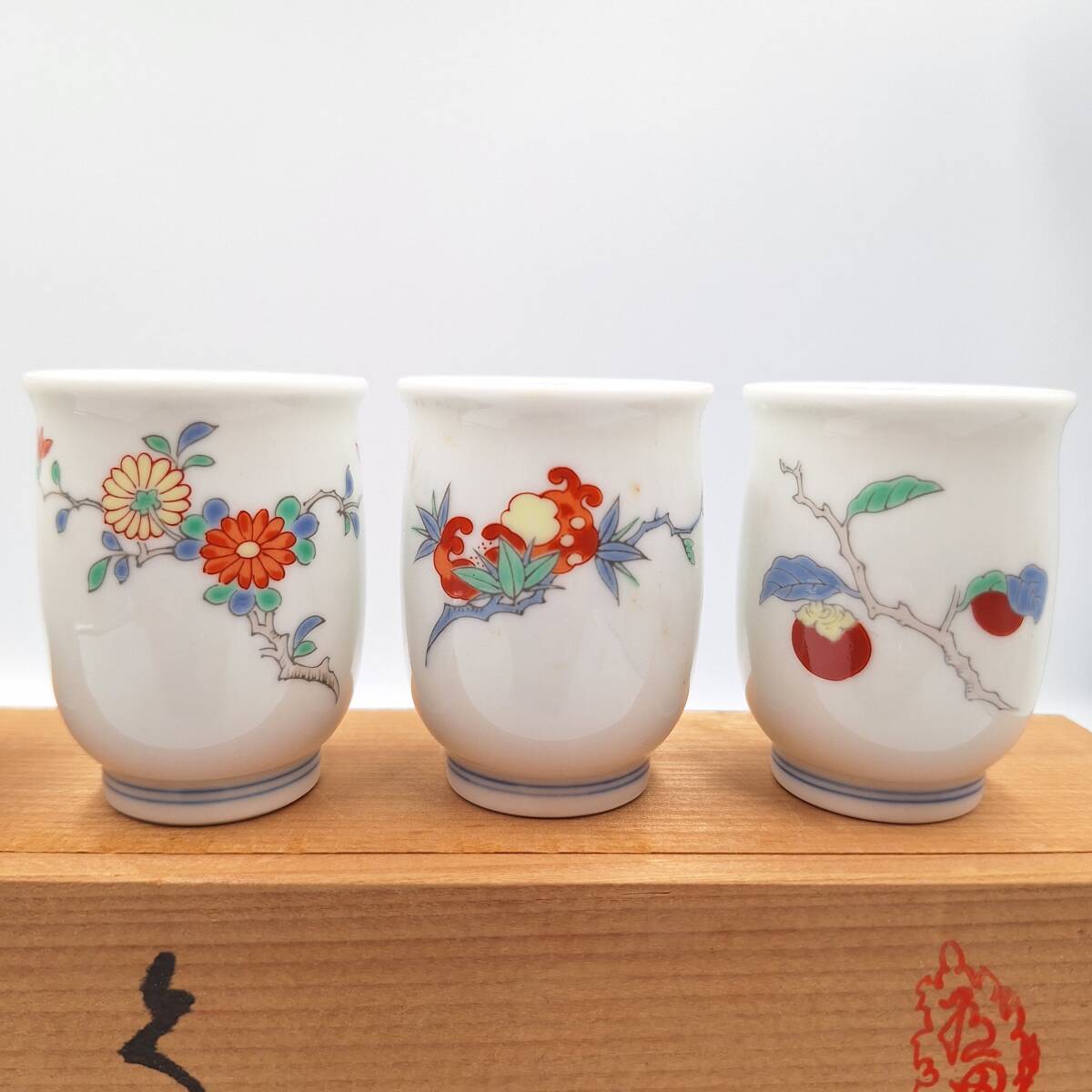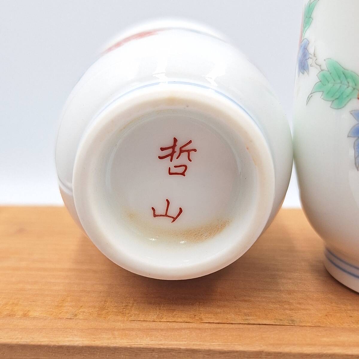 有田焼 哲山作 ぐい呑 九谷 ぐい呑み 盃 酒器 木箱入り 未使用 保管品 絵変わり 色絵 陶器 和食器 【9580】