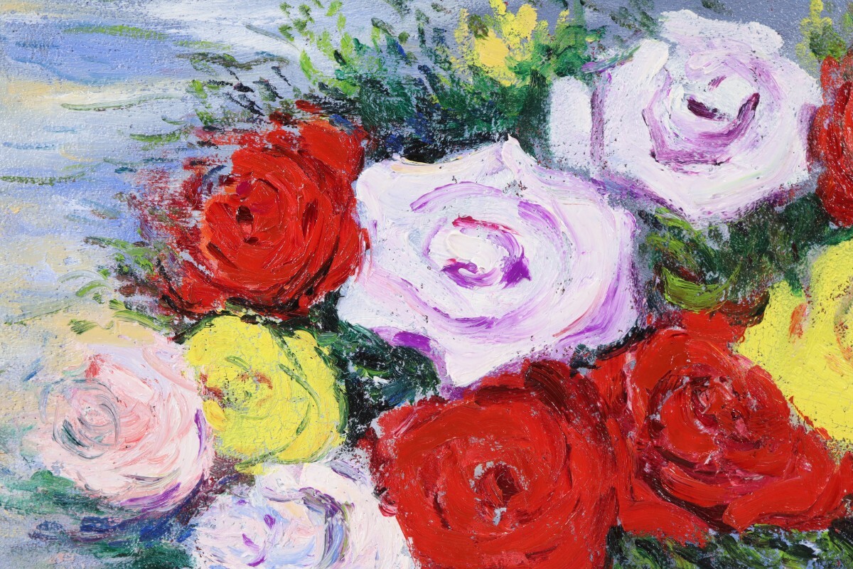 真作 小阪謙造 1996年油彩「ばら」画寸 F4 大阪府出身 元旺玄会会員 薔薇の花びらは厚みのある筆致で表現、立体感や生命力が伝わる 11413