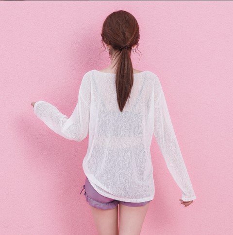 ・程よい透け感のあるシアーロンTは気になるお腹まわりやヒップをカバーしてくれます。