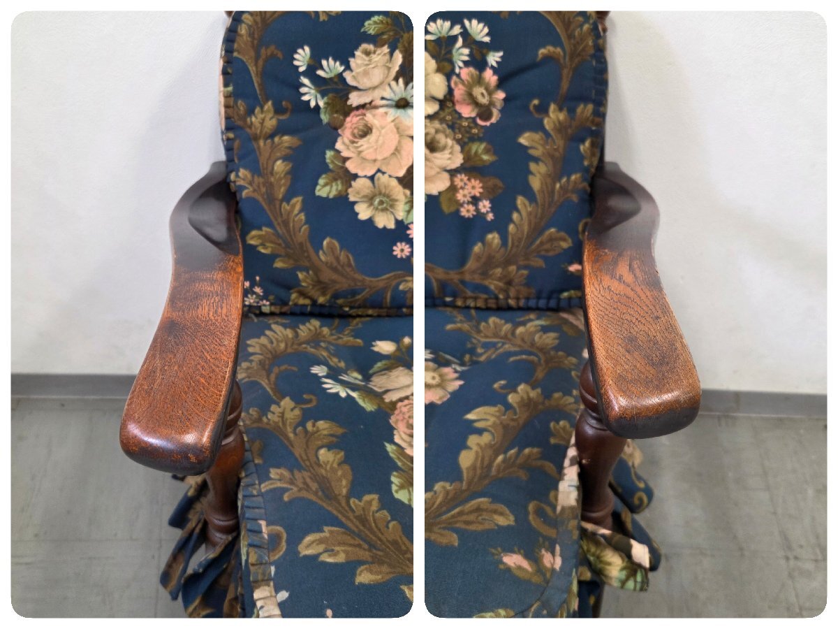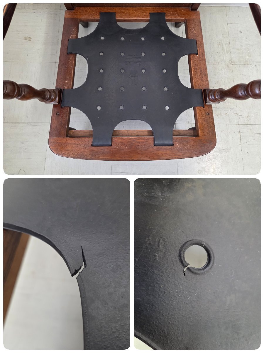 肘掛け部分に日焼けが、座面のゴム部分に破れがございます。