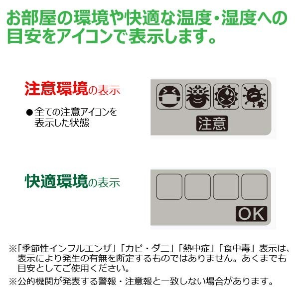 湿度測定範囲:25%RH~85%RH、測定精度:±8%RH(25℃) 12時間制/24時間制切替式 六曜表示(2030年12月31日まで) デジタル文字高(最大)56mm