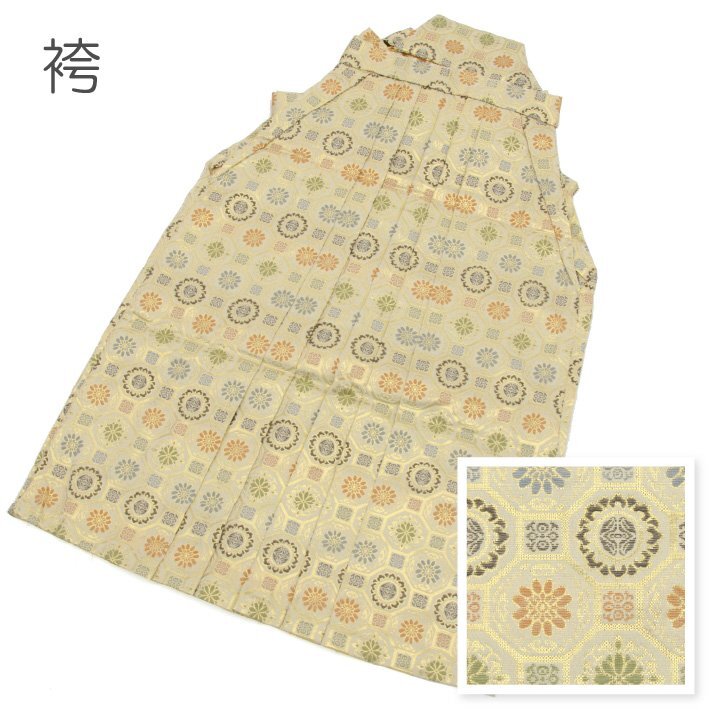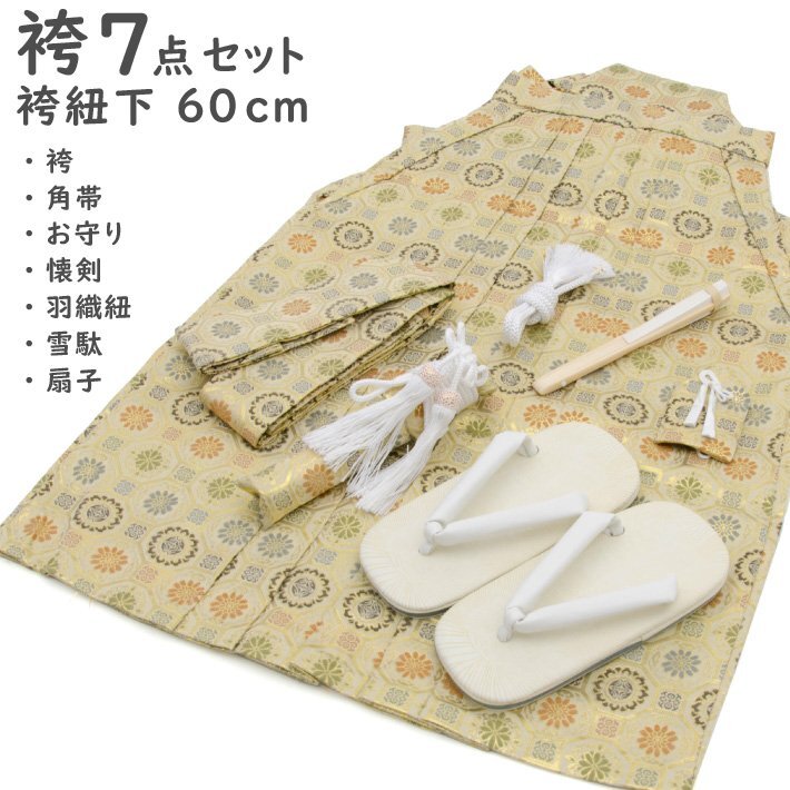 金襴柄の袴の7点セットになります。 (1)袴 (2)角帯 (3)雪駄 (4)扇子 (5)懐剣 (6)羽織紐 (7)お守り |