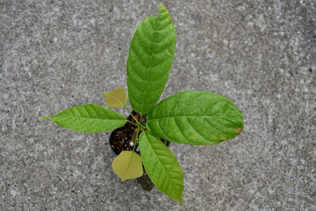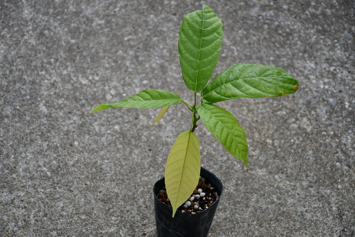 チョコレートノキとして有名なカカオです。この株はベトナム産です。品種は不明です。サイズは3.5号ポット、高さ25センチ、ワイド30センチです。Theobroma cacao この商品は100サイズです。