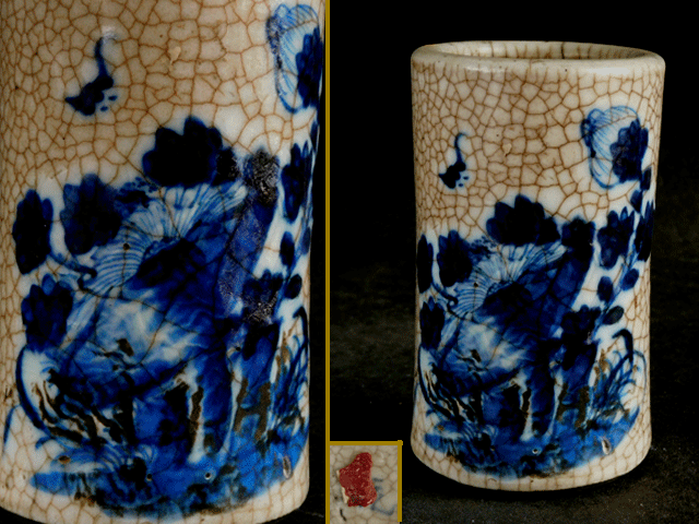 中国 花に蝶 筆筒 筆立 中国文物局鑑定蝋印付