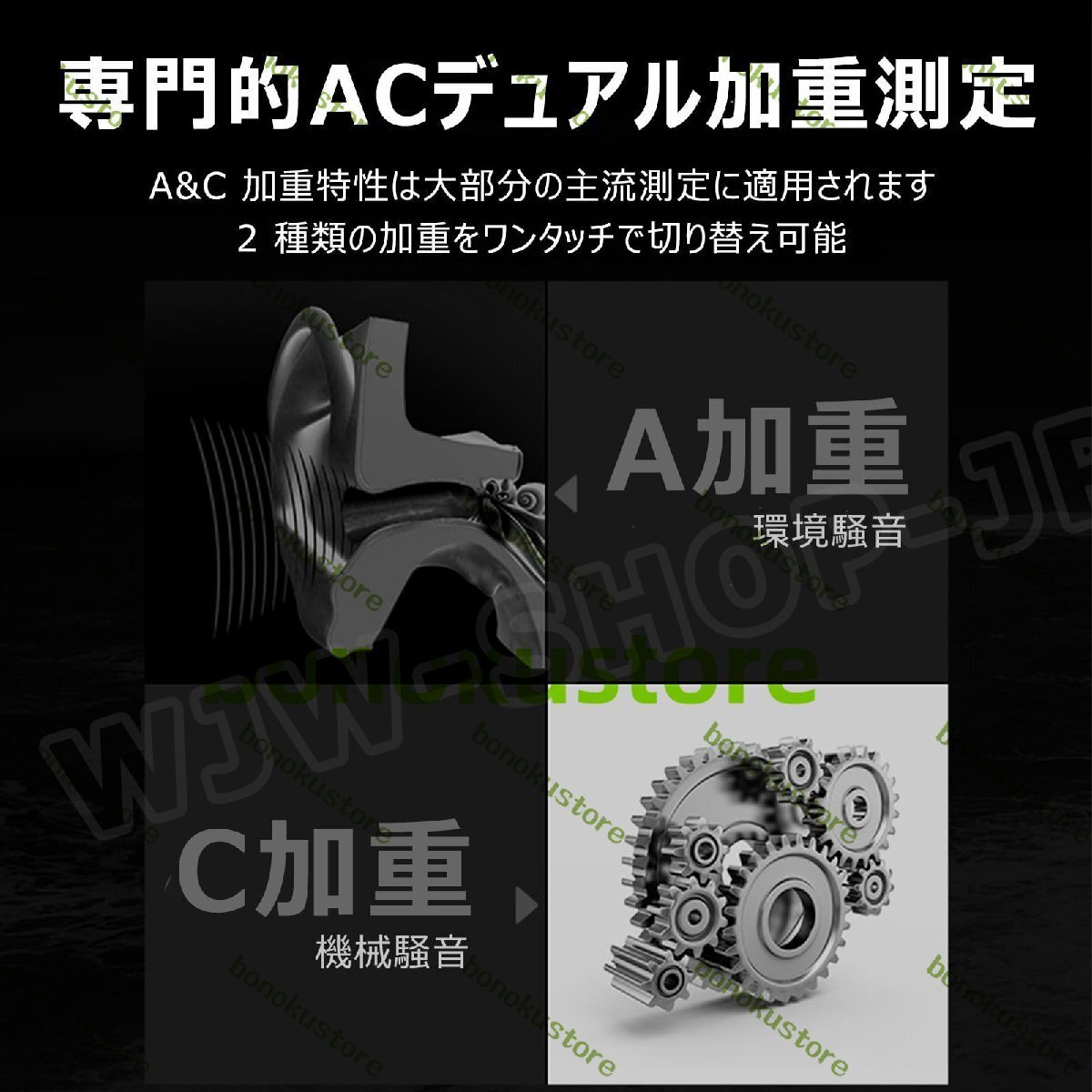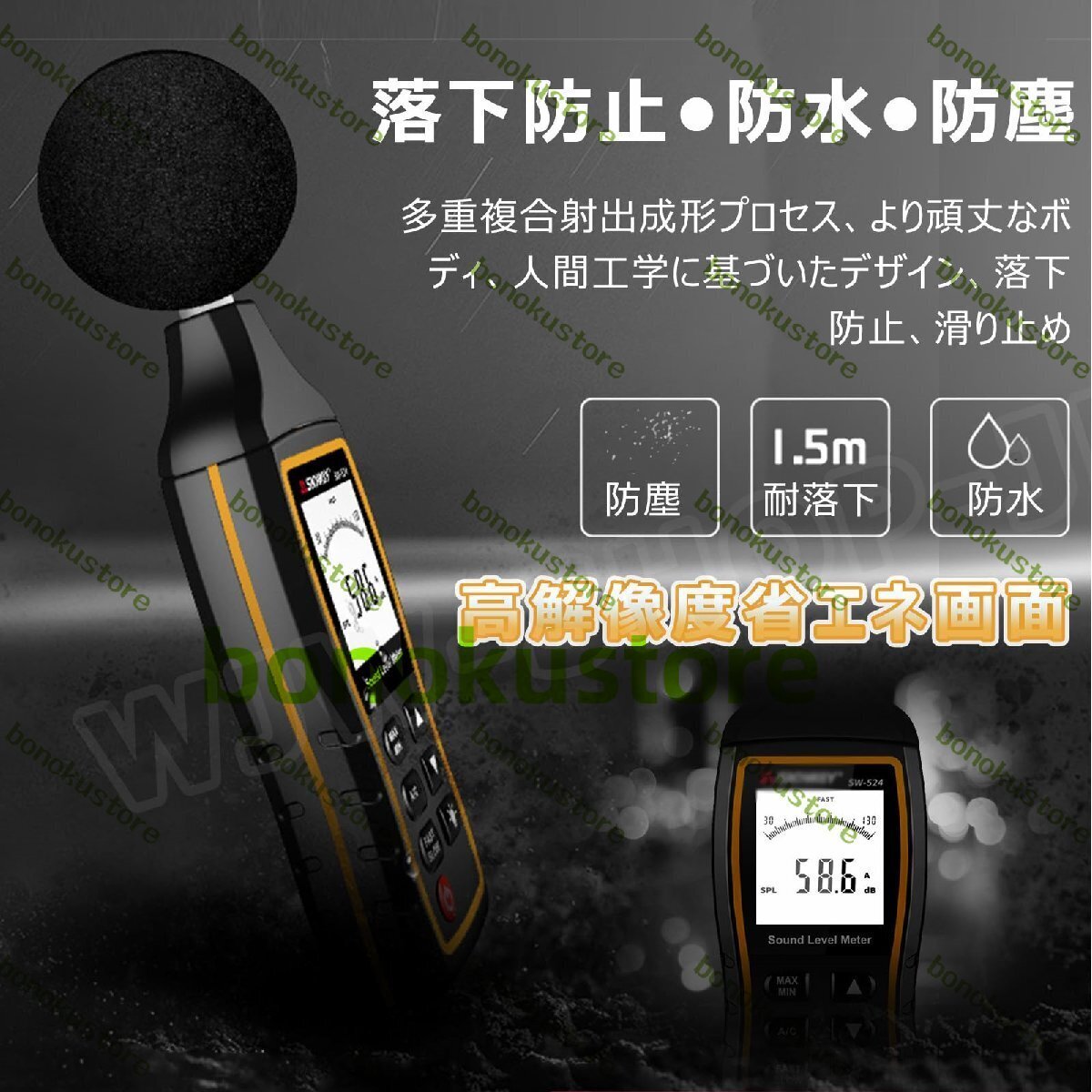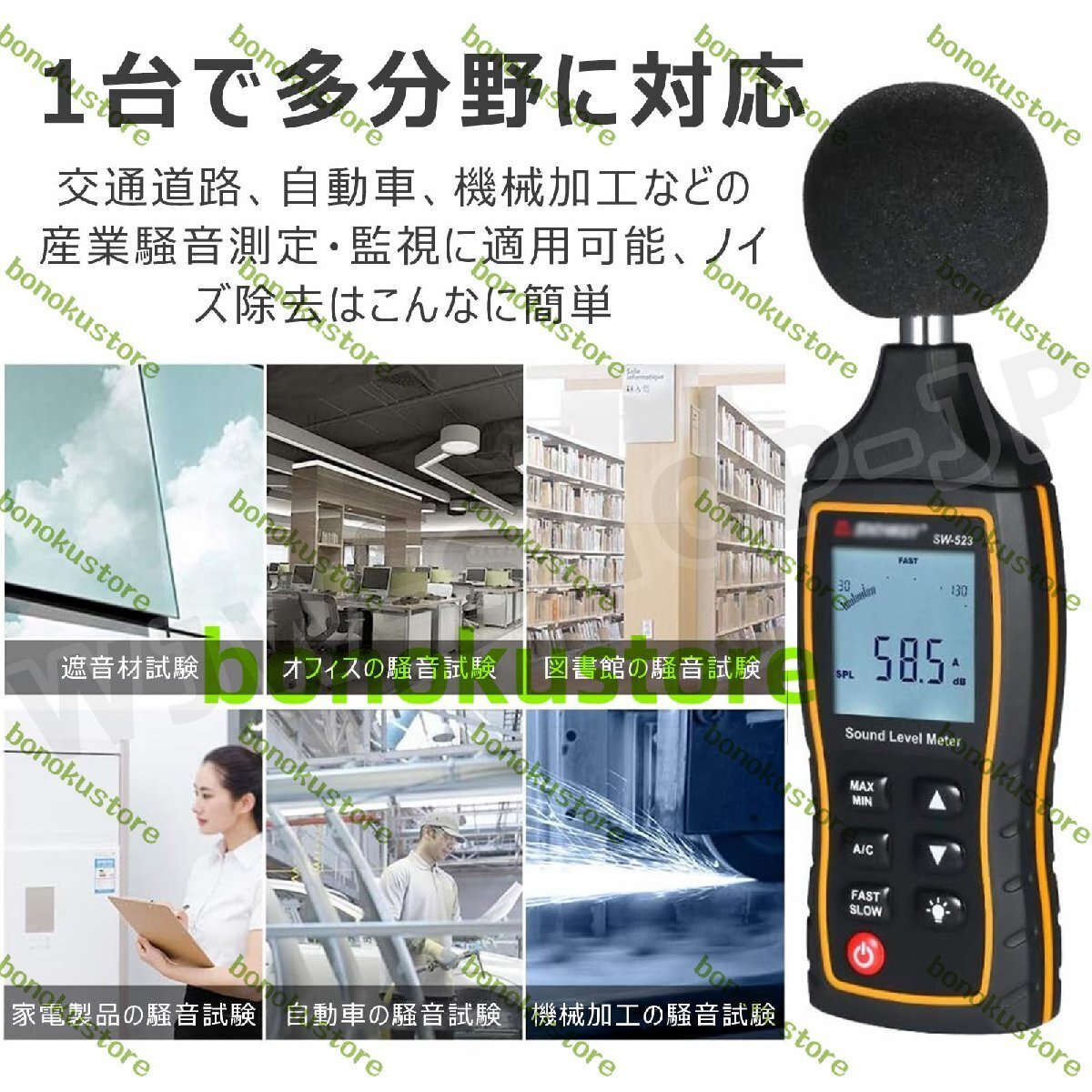 高精度・高機能な騒音計 SW-524|産業・環境・日常生活まで、あらゆる騒音測定に最適!【なぜこの製品を選ぶのか?】この騒音計は、30dB から 130dB までの広範囲な音圧レベルを ±1.5dB の高精度で測定できます。周波数応答は 31.5Hz~8.5KHz で、人の耳が感じる音の周波数特性をより正確に捉えることができます。A 重み(環境騒音向け)と C 重み(機械騒音向け)の 2 種類の加重特性をワンタッチで切り替えることができ、様々な測定シーンに最適に対応します。【多岐にわたる適用分野】1 台で多くの分野に対応します。産業分野:交通道路での交通騒音、自動車のエンジン音や走行音、工場における機械加工音などの産業騒音の測定・監視環境分野:オフィスの騒音環境、図書館の静粛性維持日常生活:家電製品の動作音チェック、自宅周辺の騒音状況把握騒音に関する様々な試験やチェックに役立ちます。【高度なデータ管理機能】付属の USB ケーブルを使用してパソコンに接続することで、以下の機能が利用可能です(SW-524 モデル)。測定データの保存記録をダウンロードリアルタイムでサンプリングしたデータをグラフで確認アイコンやデータを印刷1 分ごとのデータ保存が 60 セット、最大 17 時間連続でデータを記録でき、合計で最大 61200 セットのデータを保存することもできます。データの詳細な分析や長期的なトレンド把握に役立ちます。【使いやすさと耐久性の両立】表示と操作:1.62 インチの高解像度省エネ画面には測定値が鮮明に表示されます。最大値 / 最小値の測定機能や、応答時間(Fast:125ms/Slow:1s)の切り替え機能もあり、様々な状況に対応して正確なデータを取得できます。バックライト付きスクリーンは暗い場所での測定でも視認性を確保します。耐久性:本体は多重複合射出成形プロセスで作られており、防塵・防水機能を備え、1.5m の落下にも耐える頑丈さを持っています。人間工学に基づいた形状で持ちやすく、滑り止めも考慮されています。【利便性の高い追加機能】データ記憶機能:過去の測定データをいつでも確認できます。時間表示機能:測定した時間を正確に知ることができます。アラーム機能:特定の騒音レベルを超えた際にアラームを鳴らすことができ、注意が必要な状況を迅速に把握できます。センサー:6mm の静電容量式マイクセンサーを採用し、高感度で正確な測定を実現しています。電源:3 本の 1.5V AAA 電池で動作し、持ち運びも簡単です。【仕様】測定範囲:30~130dB精度:±1.5dB周波数応答:31.5Hz~8.5KHzAC、DC信号出力加重特性:A/C解像度:0.1dBサンプリング周波数:2 回 / 秒マイク:6mm 静電容量式電源:3×1.5V AAA 電池サイズ:63.5mm×27mm×215mm接続:USB(データ転送・充電)【まとめ】この騒音計 SW-524 は、高精度な測定、多岐にわたる適用分野、高度なデータ管理機能、使いやすさと耐久性の両立、利便性の高い追加機能を兼ね備えています。産業現場から日常生活まで、あらゆる騒音測定のニーズにお応えする、信頼性の高いツールです。