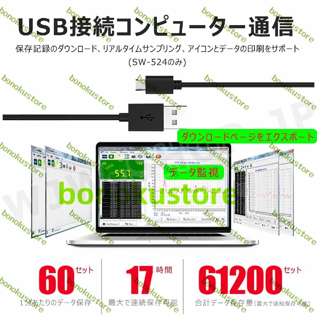 【USB 接続による PC 通信機能】付属の USB ケーブルを使用してパソコンに接続することで、測定データの保存記録のダウンロード、リアルタイムサンプリング、アイコンとデータの印刷が可能です(SW-524 モデル)。1 分ごとのデータ保存が 60 セット、最大で 17 時間連続保存可能で、合計データ保存量は最大で 61200 セットにも達します。データの詳細な分析や管理が容易になります。