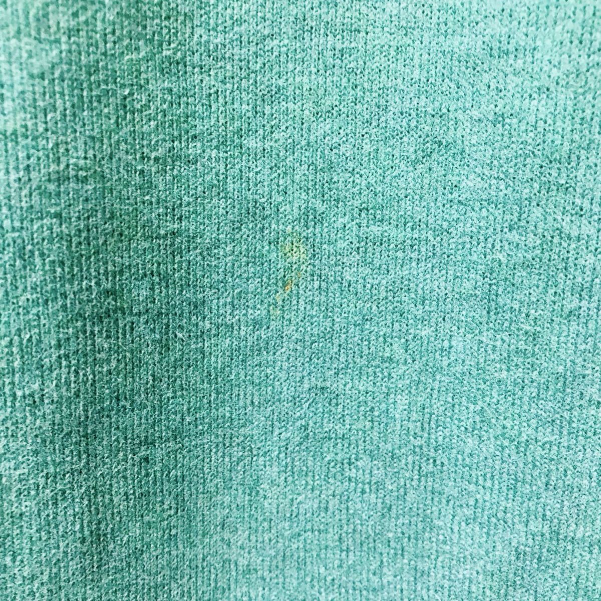クリーニング済。前左肩付近にシミ、腹部に小さな汚れあり。使用感はありますが、古着の風合いとして楽しめるコンディションです。