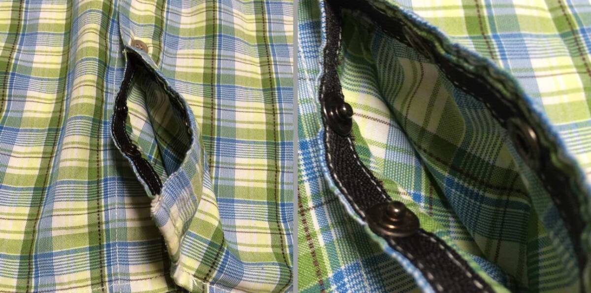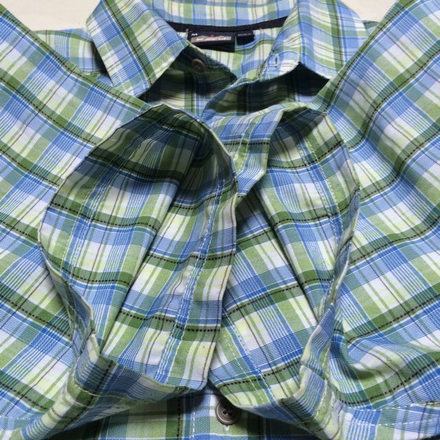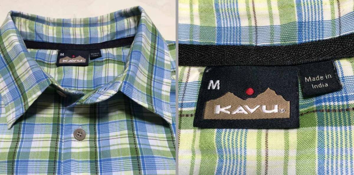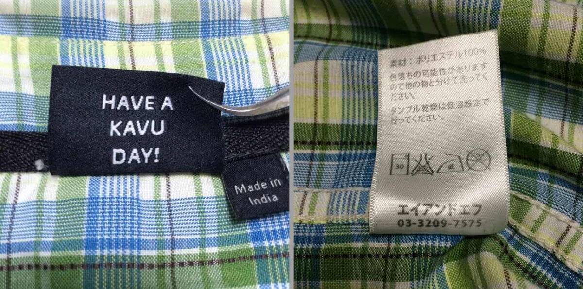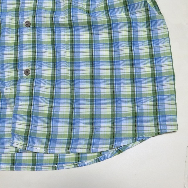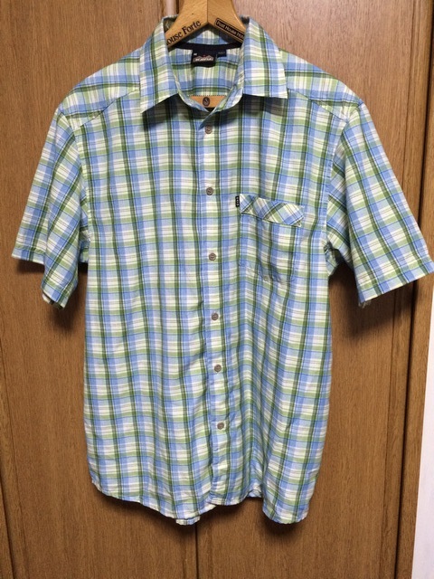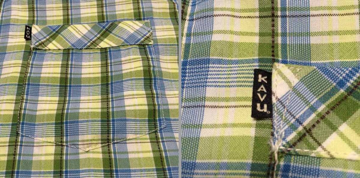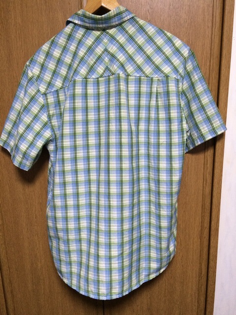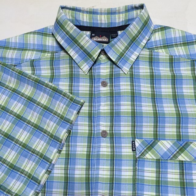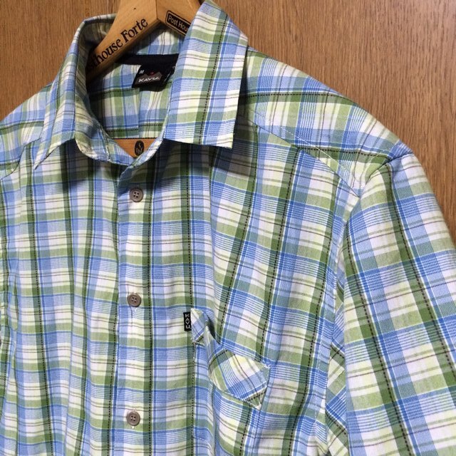 | 商品説明・状態 | 1.ほぼ新品 Kavu の半袖スタンドカラーシャツで、青色と緑色のギンガムチェックです。 2.ポリエステル製の薄手生地を使っているのでとても肌触りの良い生地で出来ています。 3.前立ての裾に小さなポケットが付いていて、スナップボタン留めです。エイアンドエフの取扱品です。 4.実寸を確認後、入札願います。 | |