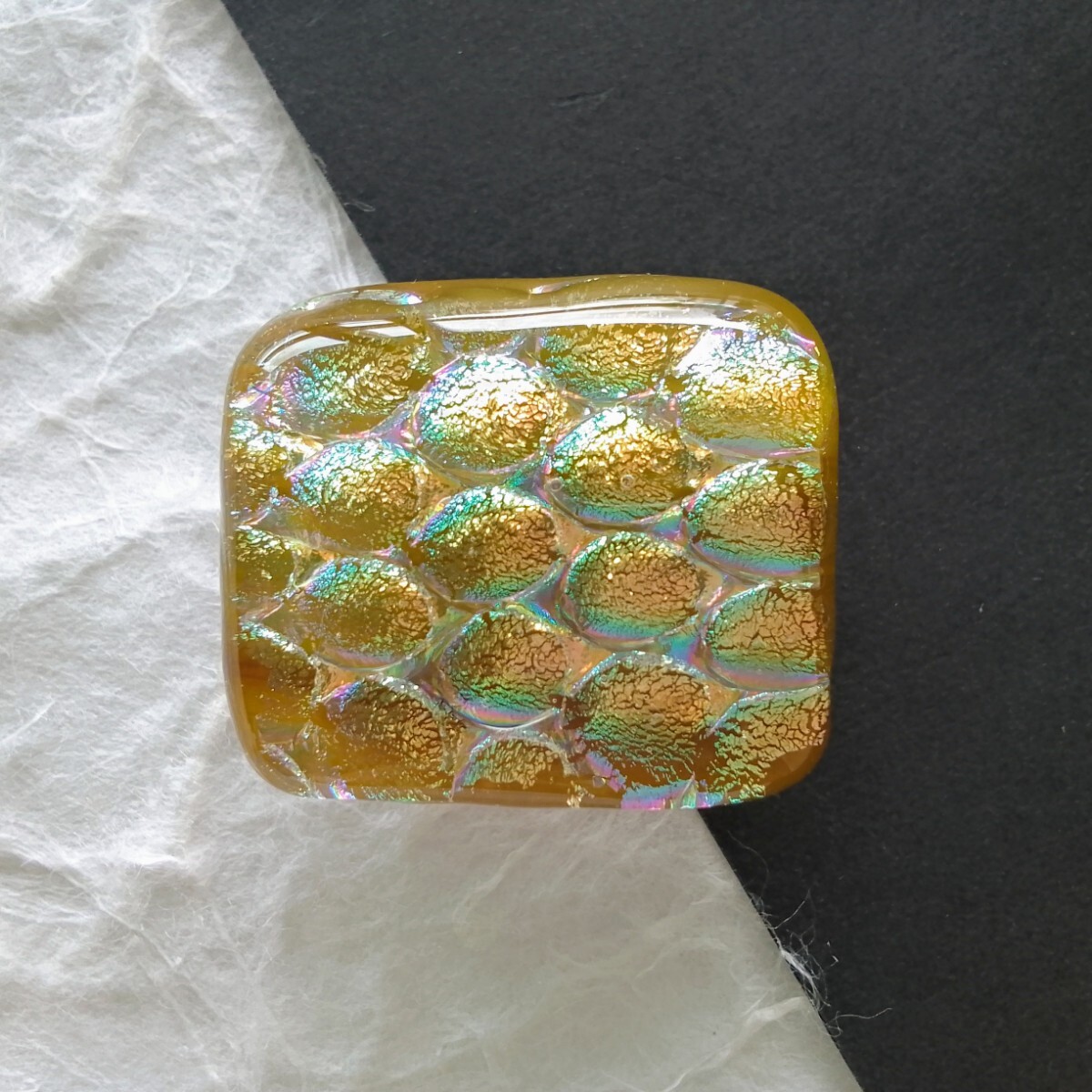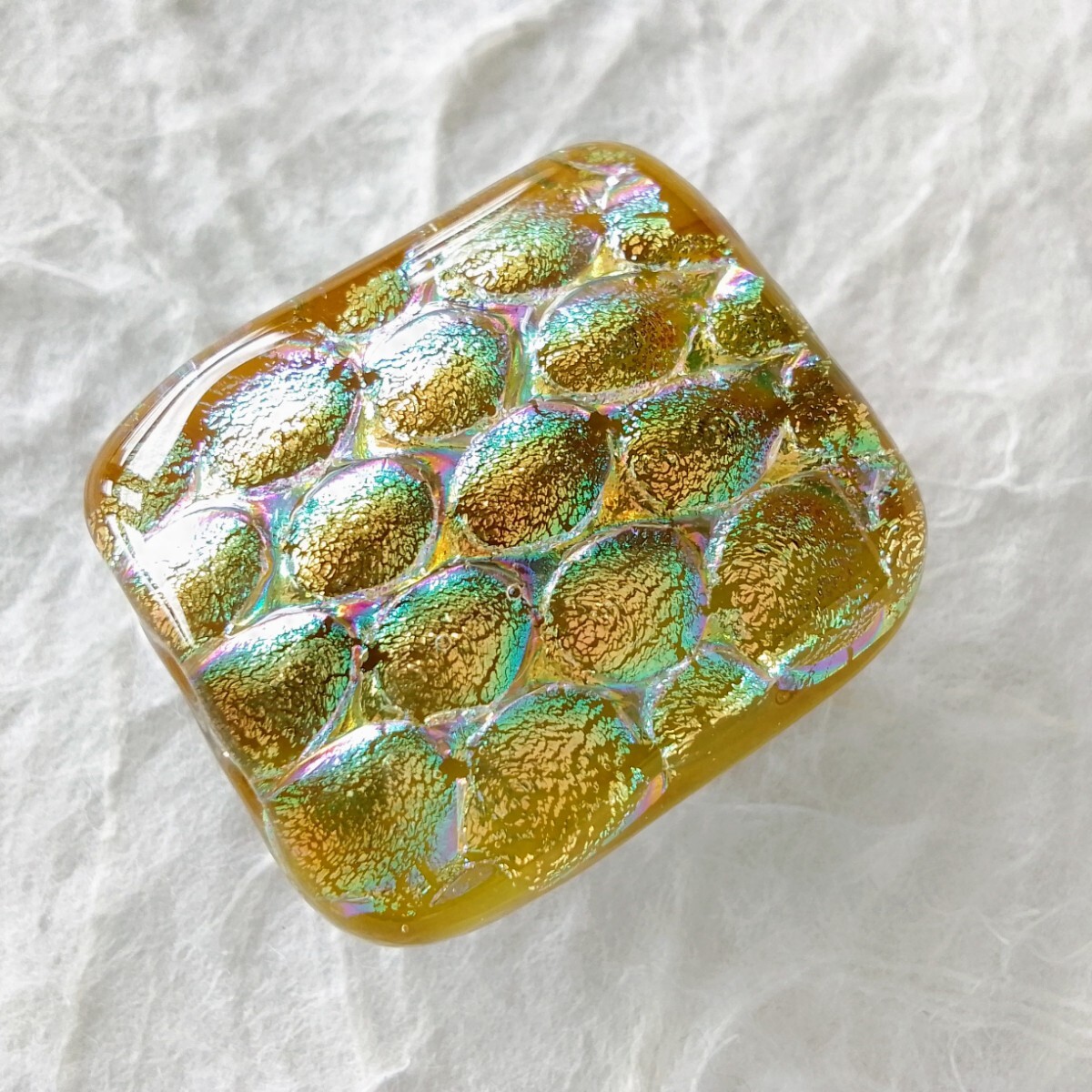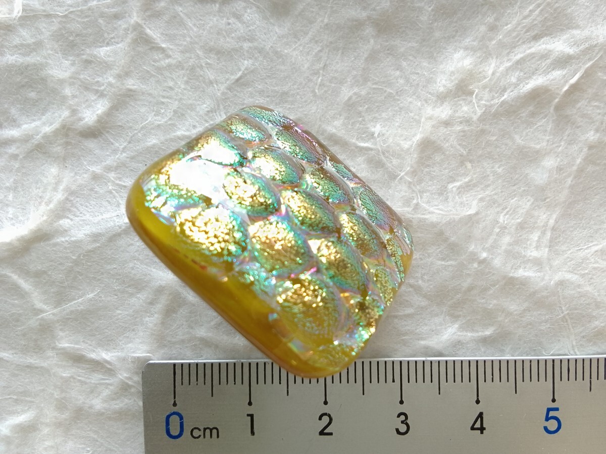 美しいダイクロガラスを電気炉で焼いた帯留め。