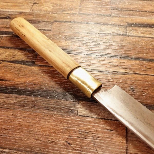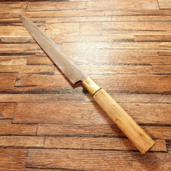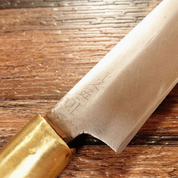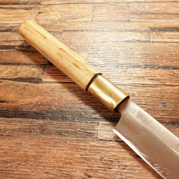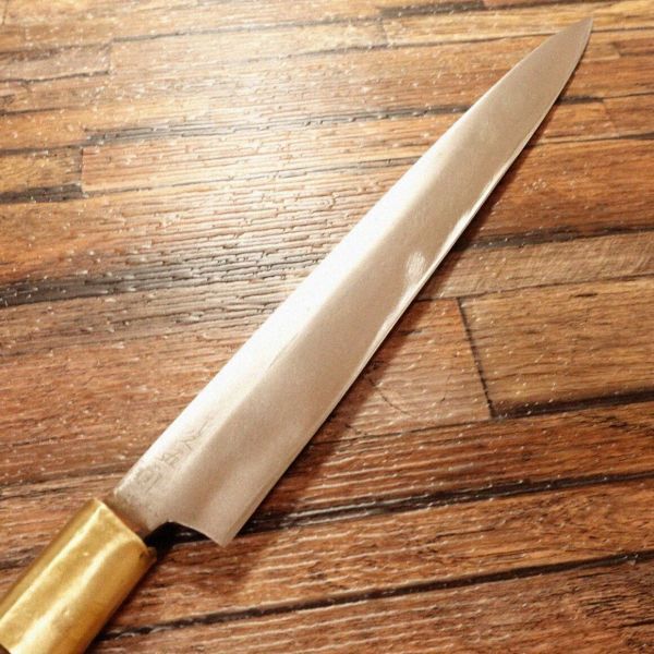 柳刃包丁は刺身を美しく引くための和包丁です。このお品は片刃のハガネ製で、丁寧にお手入れされながら使われていたお刺身包丁ですね。まだまだ活躍させてあげてほしいお品です。