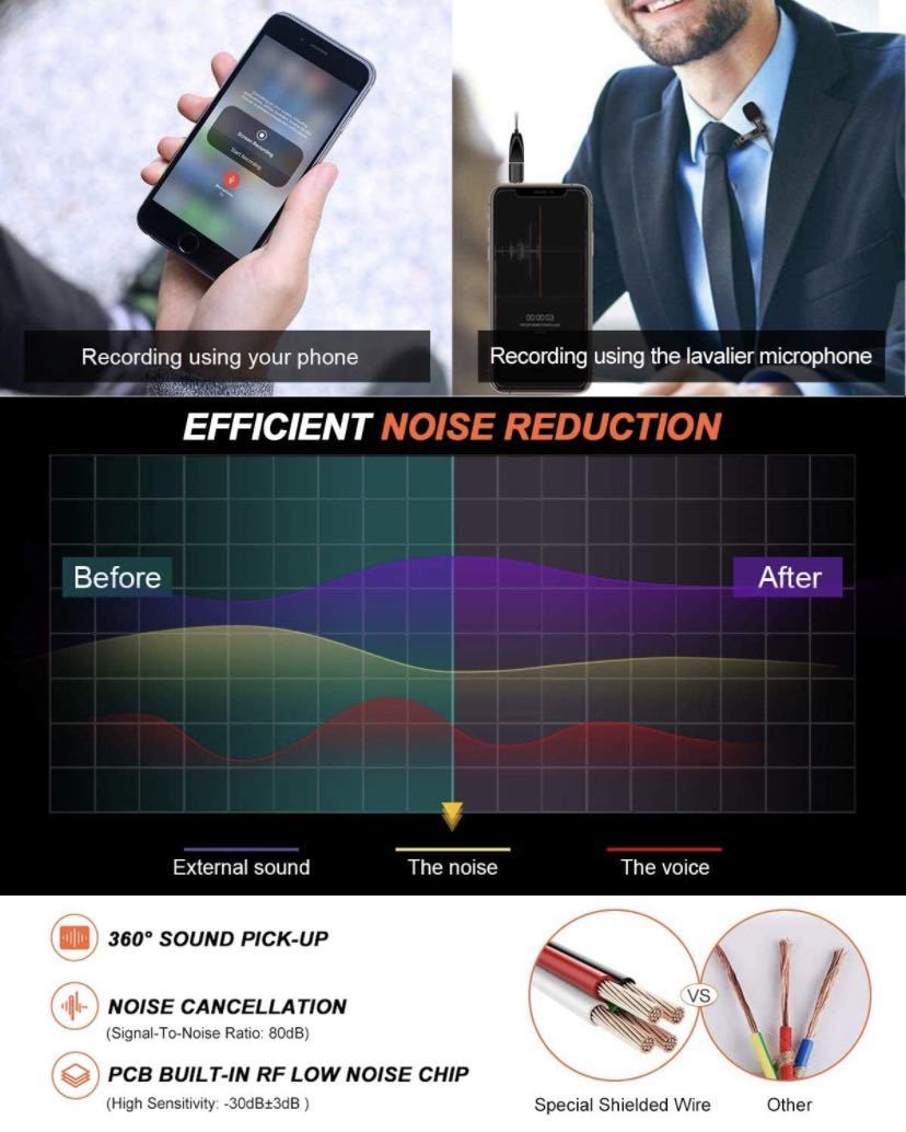 無料録音のためのノイズキャンセリング -マイクは、プロフェッショナルな結果を得るために明瞭なサウンドを録音します。静的なノイズはありません。バッテリー、アプリのダウンロード、設定は不要です。インタビュー、Podcastでのライブ放送、Skypeでの通話、Whatsapp、Facebook、Teaching、Vlogging、Youtubeなどに幅広く使用できます。