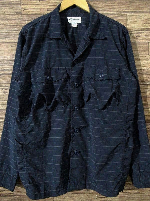 送無 美品 定価30,800 20SS SASSAFRAS ササフラス Gardener Half 長袖 ガーデナー ハーフ ナイロン タフタ ボーダー シャツ 紺 ネイビー L
