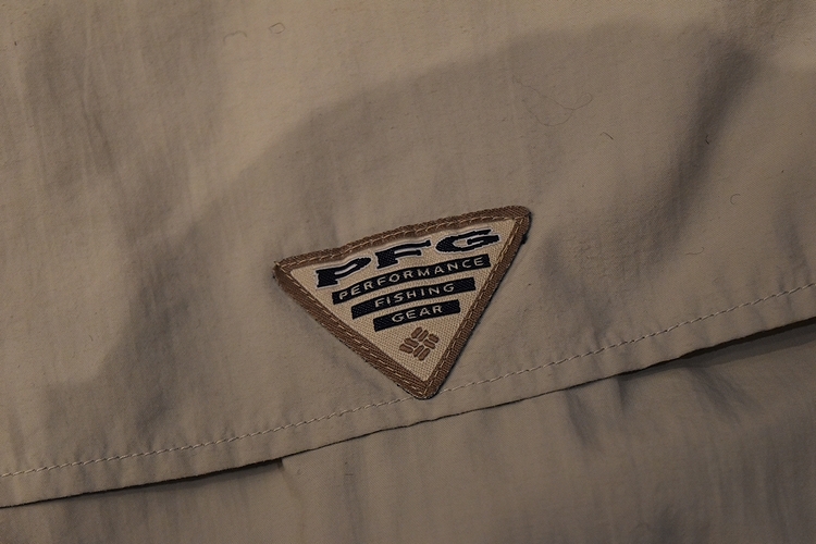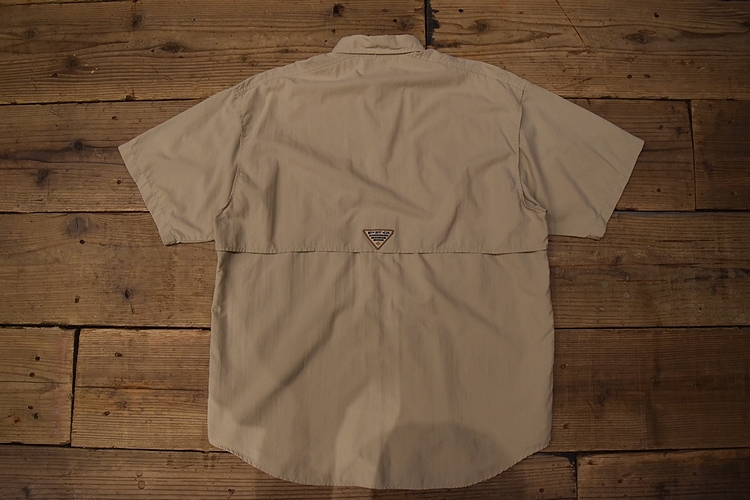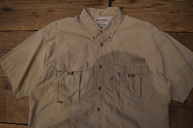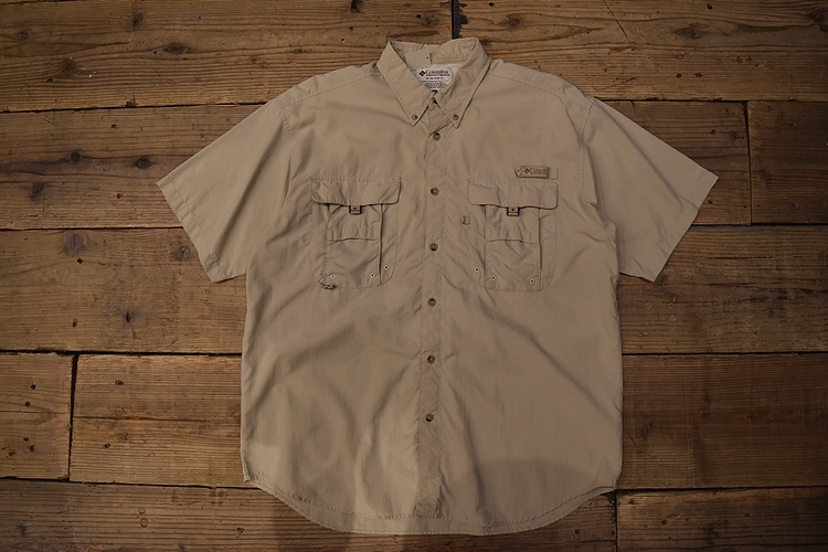 グッドスタイルアイテム◎90sビンテージColumbiaコロンビアPFG半袖ナイロンフィッシングシャツMベージュ系アメカジアウトドア t982