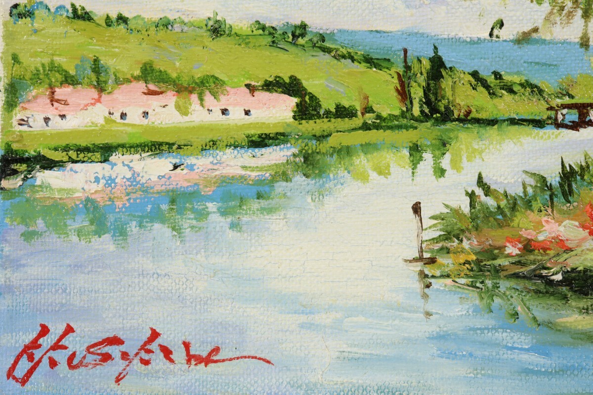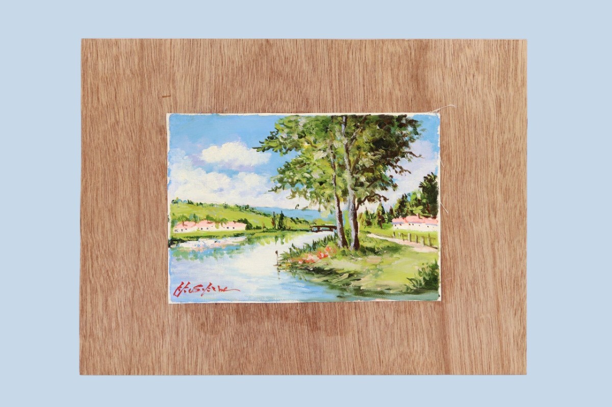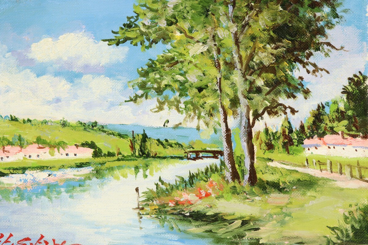 真作 日下部寛 油彩「ロワール河畔」画寸 23cm×16cm SM 岡山県出身 大阪稜線会 佐伯久に師事 空の青さと自然豊かな風景を見事に再現 11391