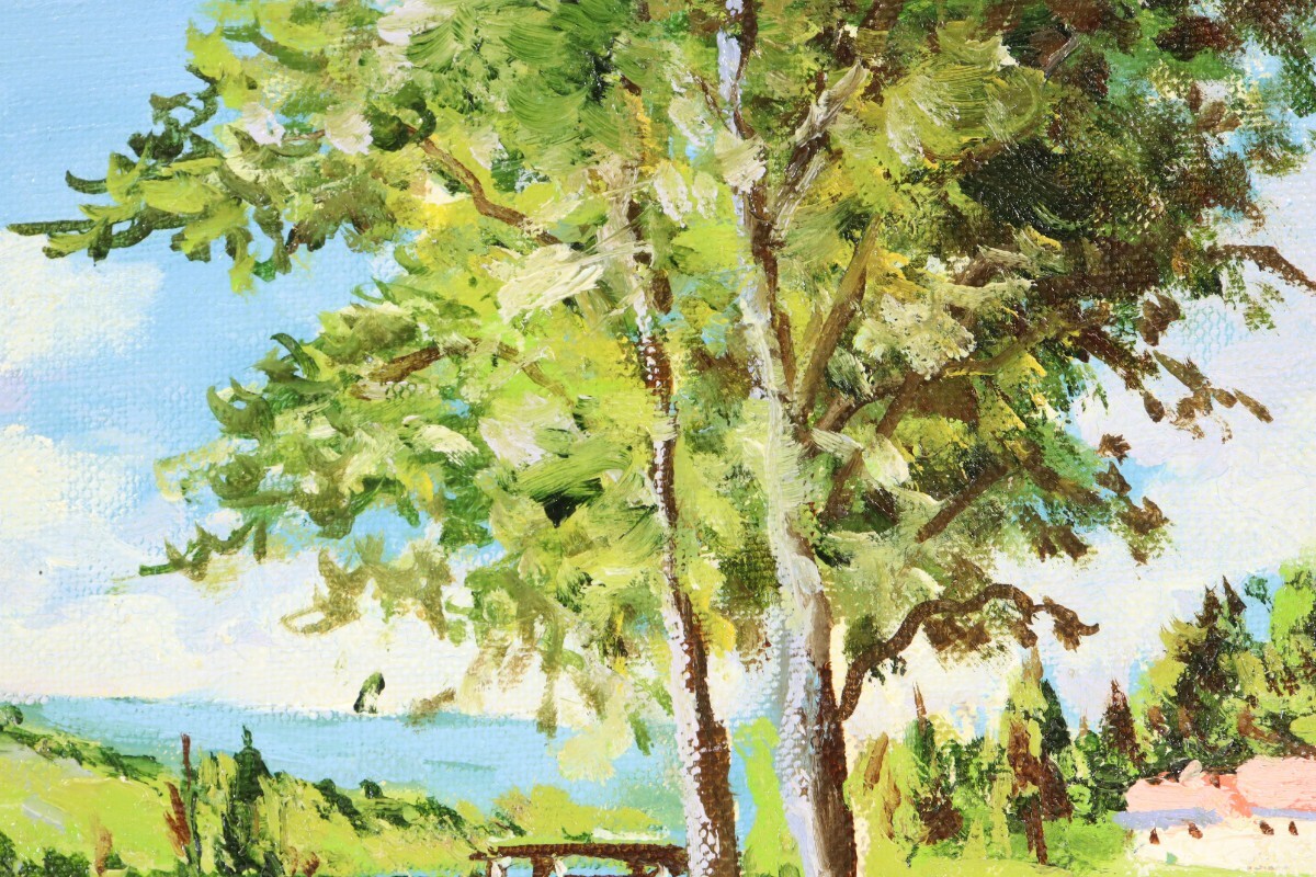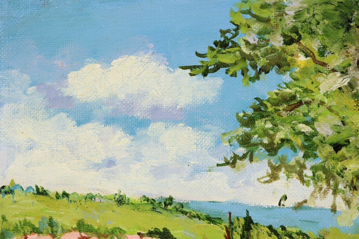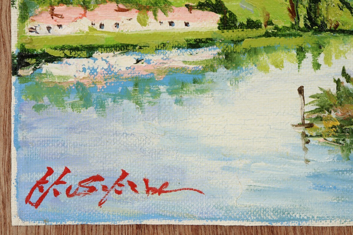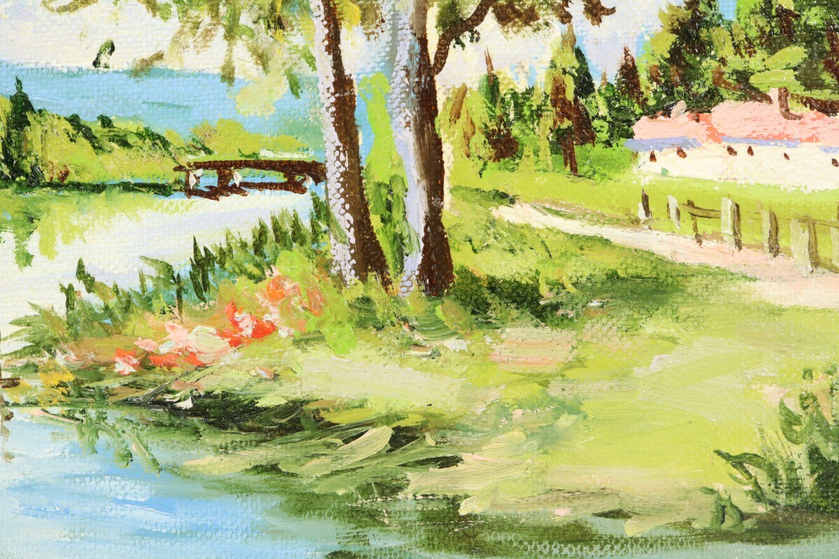 真作 日下部寛 油彩「ロワール河畔」画寸 23cm×16cm SM 岡山県出身 大阪稜線会 佐伯久に師事 空の青さと自然豊かな風景を見事に再現 11391