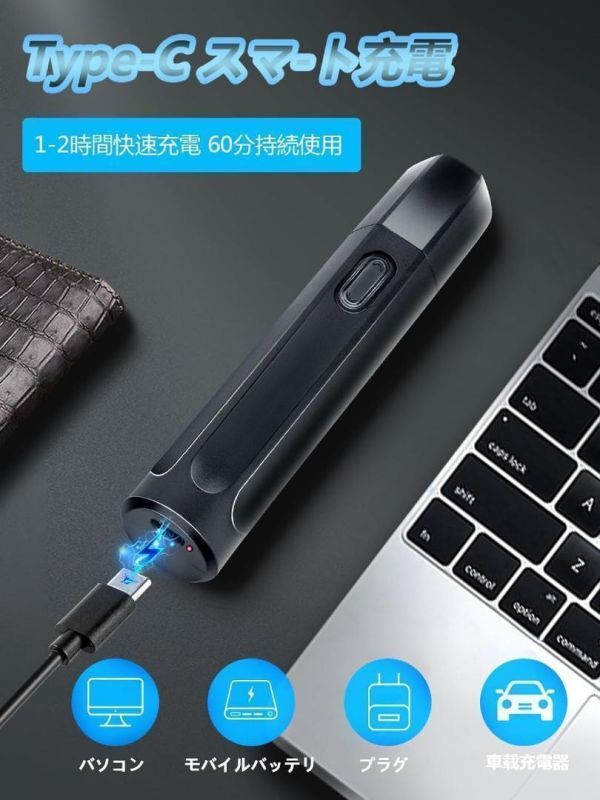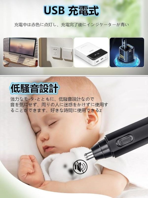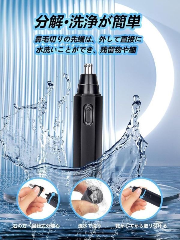 【USB-Type-cポート& 省エネ・環境に優しい 】本体は付属のUSB-Type-cケーブルで簡単に充電できます。バッテリーには高性能リチウムイオンバッテリーを使用しています。2日に1回使用し、1回の使用時間が2分とすると、2時間の充電で2ヶ月利用できる超省電力仕様です。(注意:充電中は使用しないでください。鼻毛カッターの使用寿命を確保するために、充電中には電源を入れることしないでください ) 【IPX7防水&お手入れが簡単】IPX7防水です。鼻毛切りの先端は、反時計回りで取外して直接にすすげるので、、残留物や細菌の繁殖を防ぎ、いつでも清潔に保つことができます。