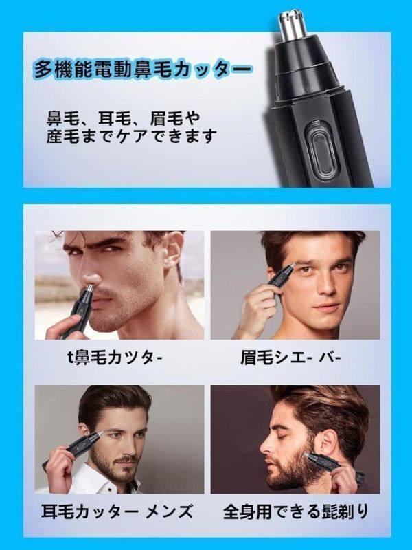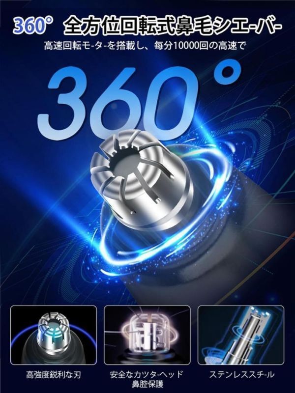 【一台3役の多機能電動鼻毛カッター】鼻毛だけでなく、眉毛トリマー、耳毛もケアできる多機能なエチケットカッターです。デュアルエッジ刃を採用するので、側面からの毛だけではなく、上から入る毛もカットできます。人間工学に考えれた安全な外刃設計と360°回転のデュアルエッジ刃で肌に優しく安心です。
