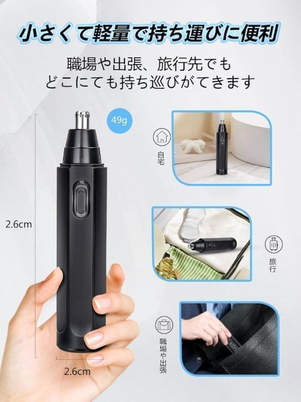 【静音設計&コンパクト仕様】マットなボディに操作しやすいスイッチを備え、手になじみ使いやすいものとなってます。鼻毛カッター最高級の大トルクのマイクロモーターを採用し、摩擦騒音を大幅に低減し、使用寿命を向上させます。サイズは 13x2.6×2.6 cmと重さも48.5gです超小型なので携帯にも便利です。職場や出張、旅行先でも、どこにでも持ち運びができます。 $440.215.1037
