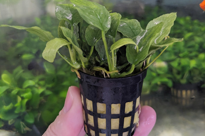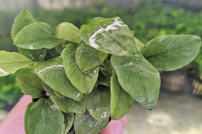 アヌビアスの仲間は水中葉、水上葉の区別はありません。輸入水草ですので農薬の使用の有無は判断ができませんので2-3週間隔離されてからの導入が安全です。