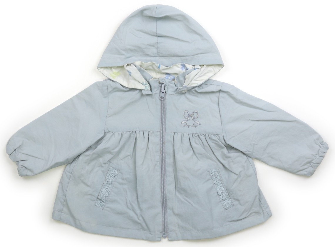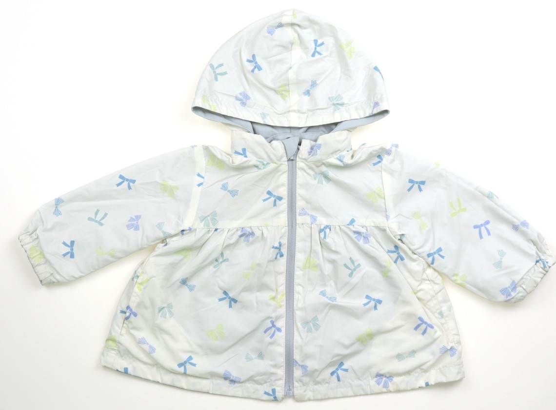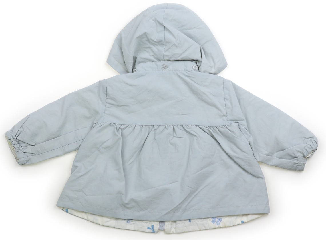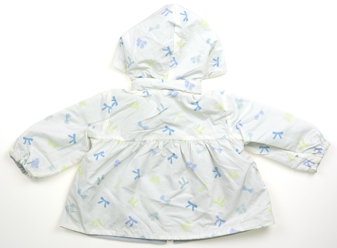 リバーシブル。フードの取り外しが可能です。無地はナイロン、ポリエステル生地でファスナーに茶色いシミあり。柄はポリエステル生地で袖に赤い汚れあり。袖口が薄汚れていますが、まだまだ普段着として活躍してくれそうです。